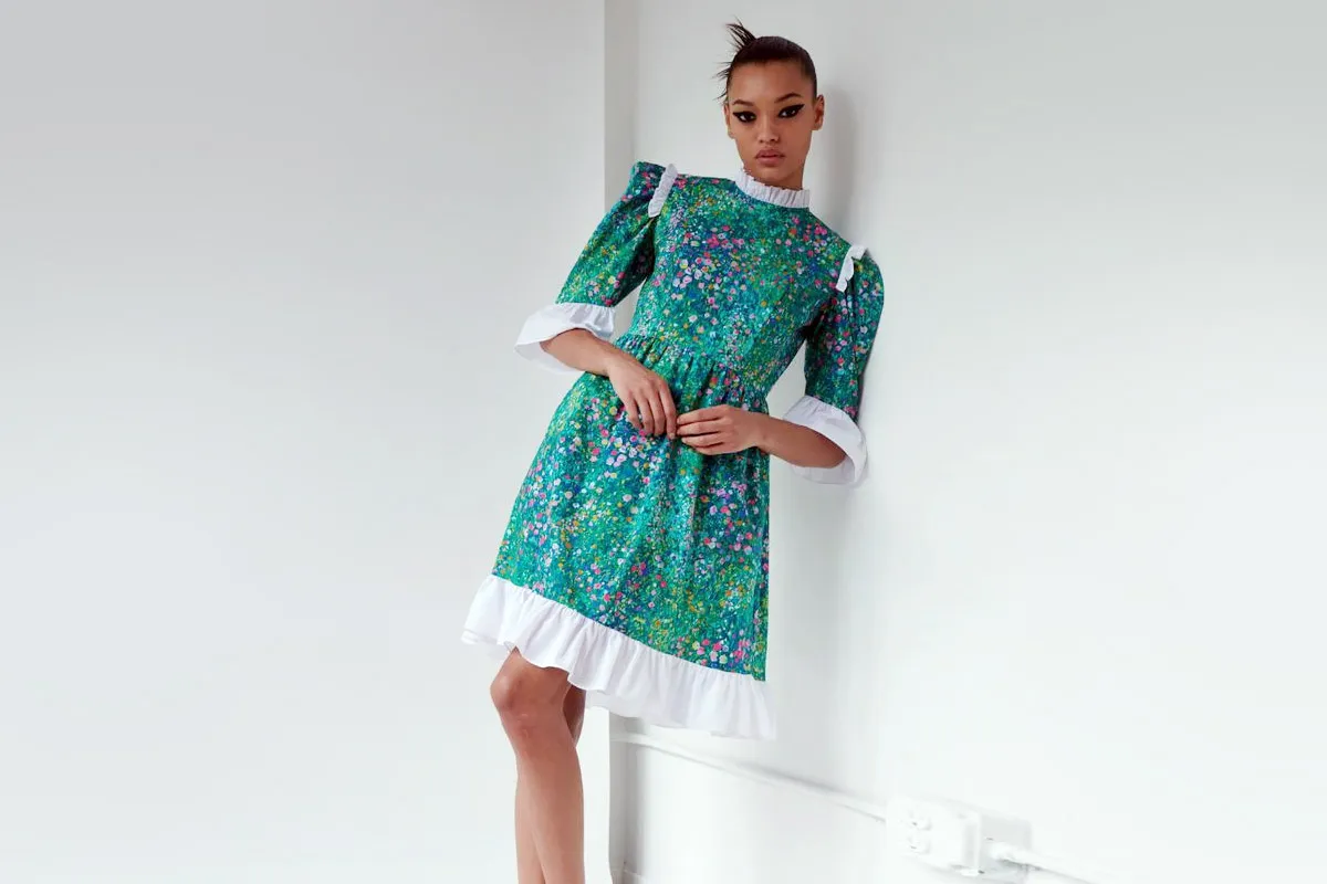 أفتح درجات الأخضر وأضافت لمسة خفيفة ناعمة مزينة المزين ببعض بالورود والزهور من مختلف الألوان الباردة ، وصُممت الجوانب باللون الأبيض ويمكنك أن تنسقي هذا الفستان مع حذاء كحلي أو ازرق او وردي .