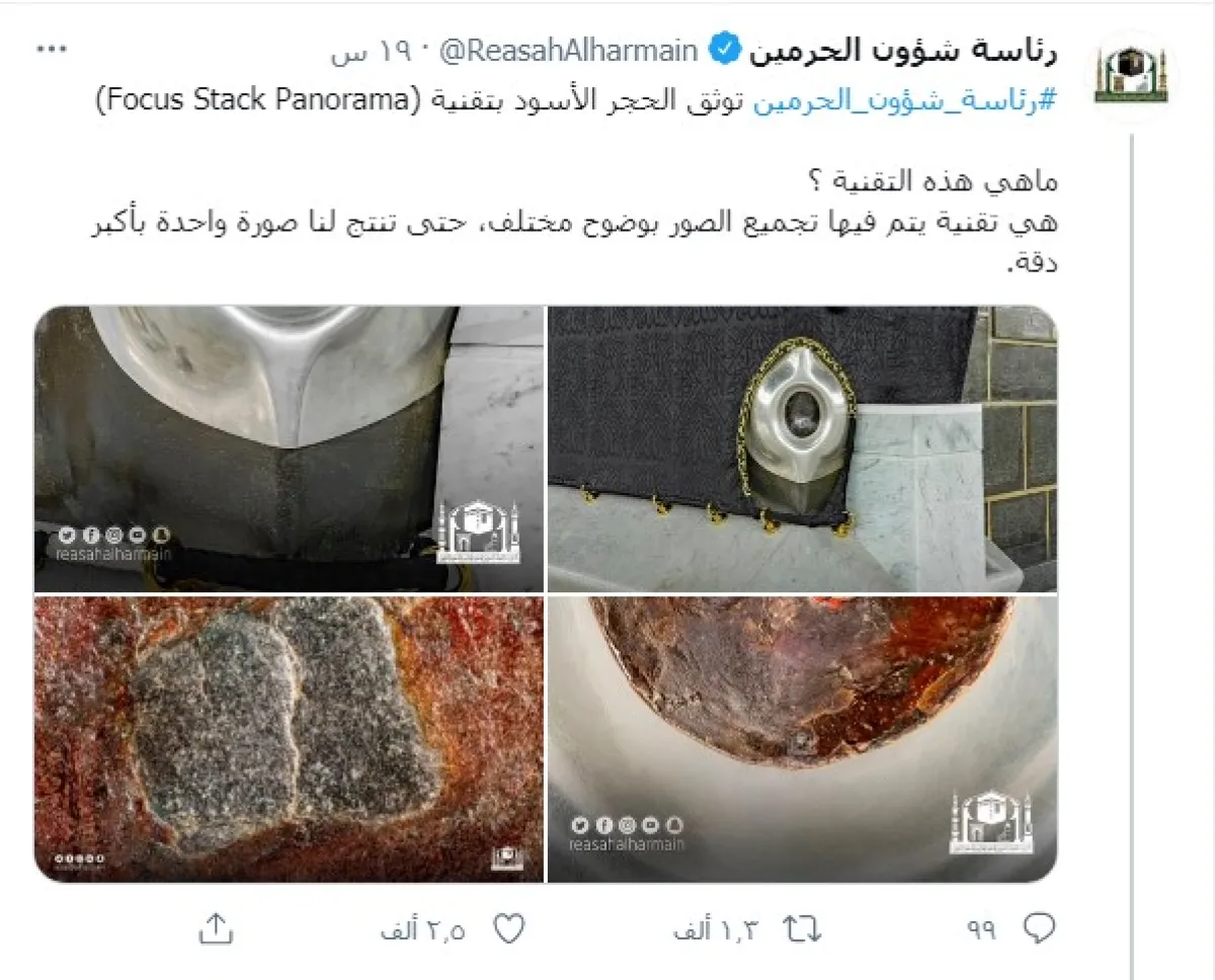 أعلنت رئاسة شؤون الحرمين في المملكة العربية السعودية، فجر اليوم الاثنين، عن توثيق الحجر الأسود بتقنية تعرف باسم "فوكس ستاك بانوراما"، Focus Stack Panorama، والتي تلتها صور غير مسبوقة لجزء من الزوايا الأربع للكعبة المشرفة في المسجد الحرام بمكة المكرمة.