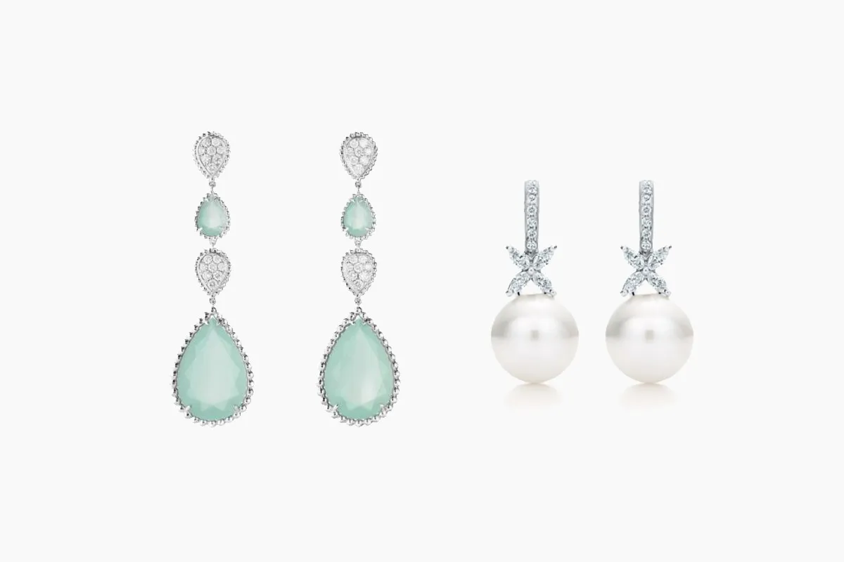 تُعد المجوهرات الفاخرة وبالأخص الأقراط الماسية جزءاً مهماً في إطلالة كل عروس، خاصة إذا وقع اختيارها على فساتين زفاف بتصميمات الكاب أو الأكتاف الساقطة، أو من دون أكمام، أو الفساتين ذات التطريزات على الصدر والأكمام؛ إذ تُكمل الأقراط إطلالة العروس الفاخرة في ليلة زفافها.