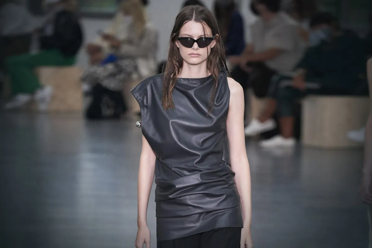 إذا كنتِ تبحثين عن تصميم راقٍ وجذاب يناسب خروجاتكِ المسائية في الصيف، يُمكنكِ الاستعانة بهذا التصميم الأنيق، لبلوزة من الجلد الأسود من ماركة Sportmax، جاءت بتصميم جذاب بدون أكمام، مع تصميم الكشكش على الخصر.