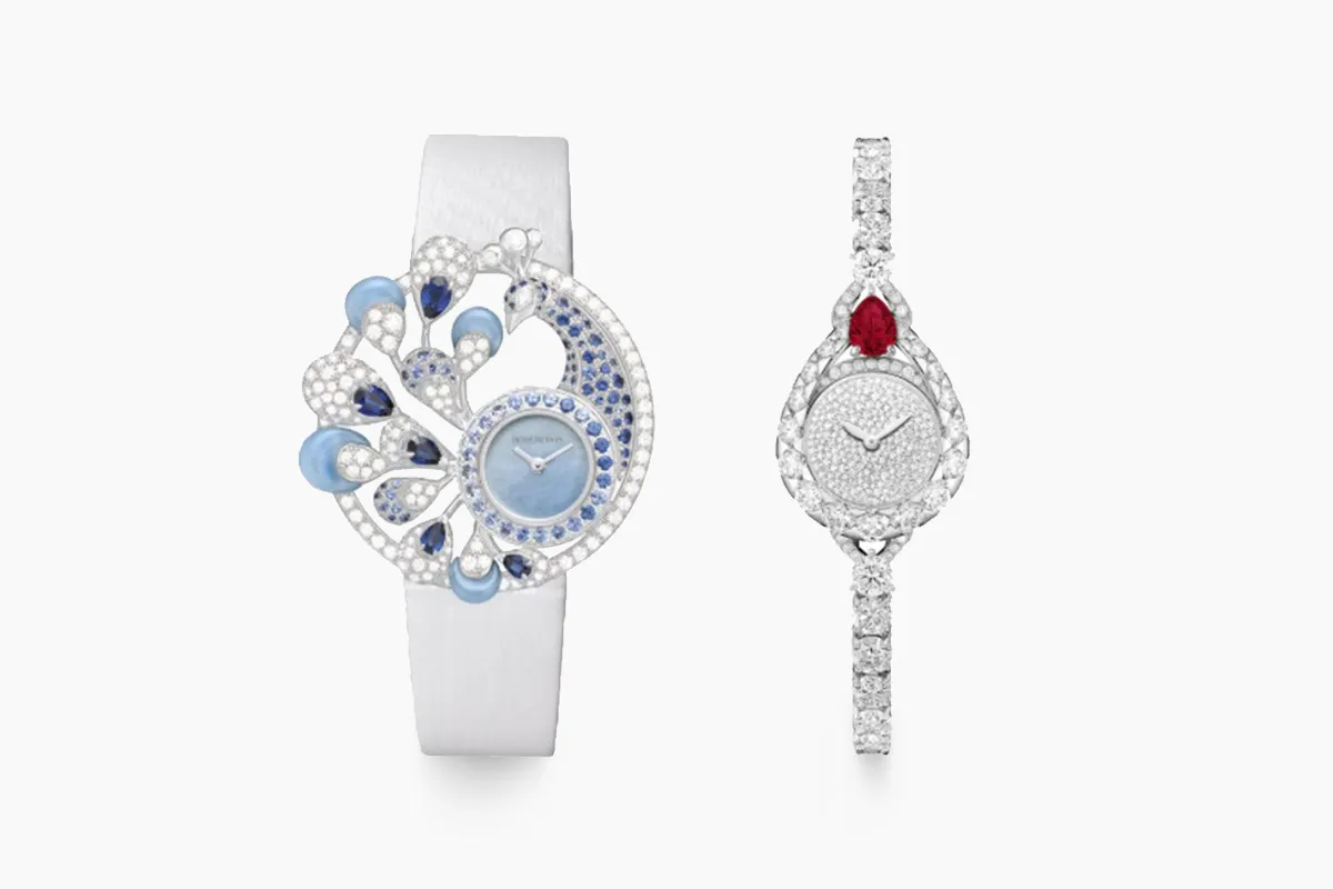 قدمت ماركة بوشرون Boucheron العديد من التصاميم الراقية للساعات المُرصعة بالأحجار الكريمة، وإذا كنتِ تبحثين عن تصميم ناعم يناسب إطلالة هادئة في عيد الفطر، يُمكنكِ الاستعانة بهذا التصميم لساعة بيضاء مُصممة من علبة دائرية، جاءت بتصميم طاووس مفتوح ومنحوت من الذهب الأبيض عيار 18 قيراطاً، مرصوفاً بالألماس والياقوت الأزرق والعقيق الأبيض ذهب.