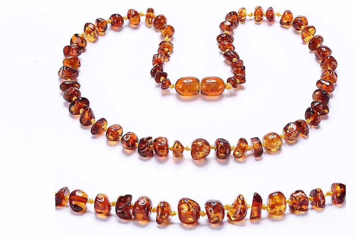 - كما أن قلادة العنبر تعرض الأطفال لخطر الاختناق بحباتها في حال وضعها الطفل في فمه وقام ببلع بعضها.