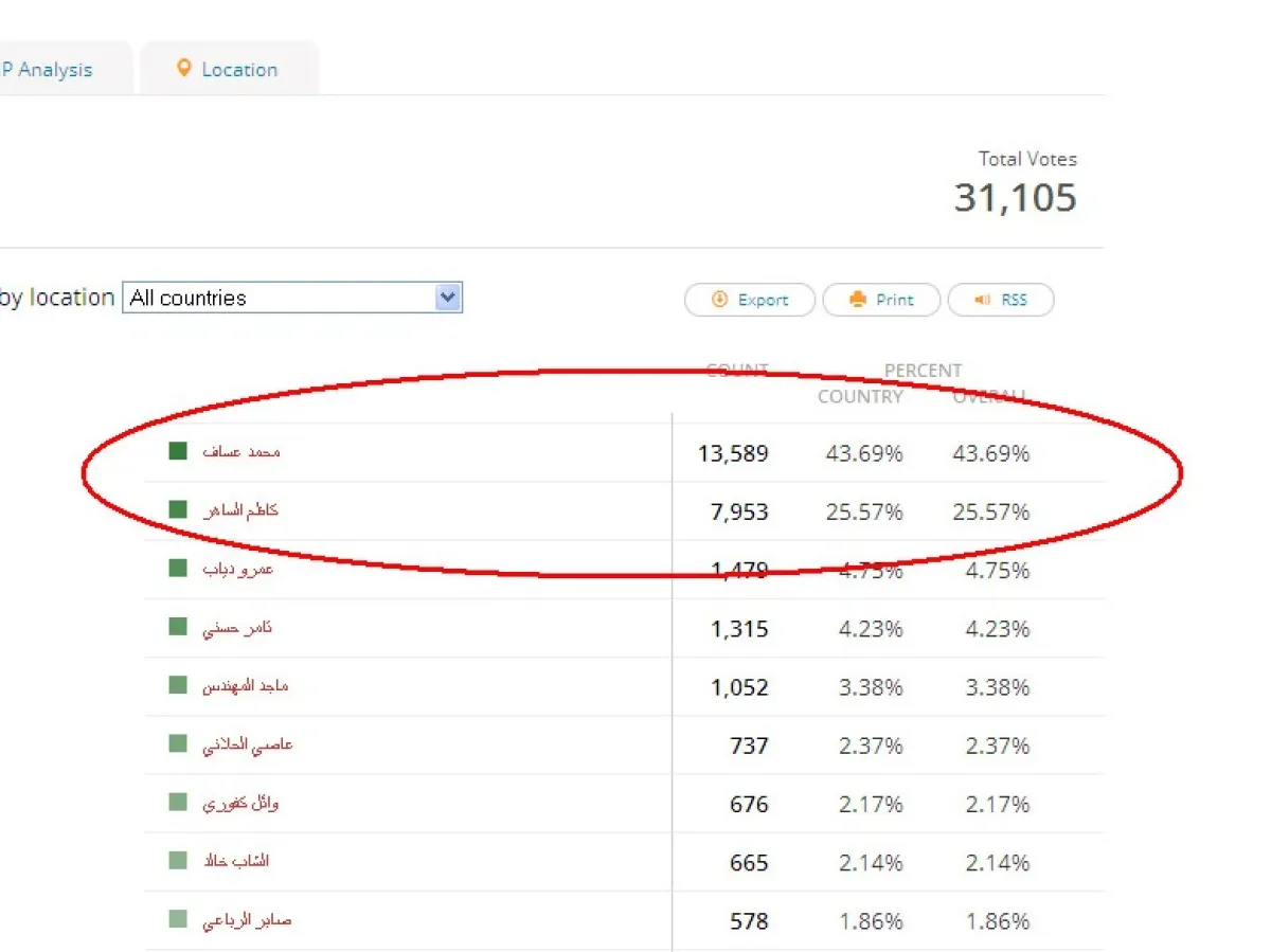 وحلّ في المرتبة الثانية كاظم الساهر بنسبة 25.58، وحصل على 7952 صوتاً.