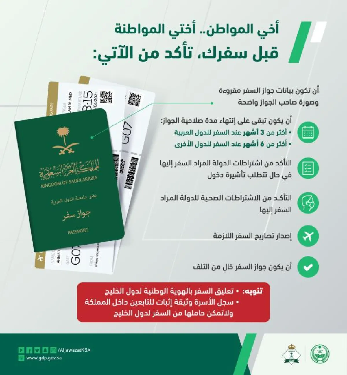 ونوهت الجوازات أن السفر بالهوية الوطنية لدول الخليج لا يزال معلقاً، كما أن سجل الأسرة وثيقة إثبات للتابعين داخل المملكة ولا تمكن حاملها من السفر لدول الخليج
