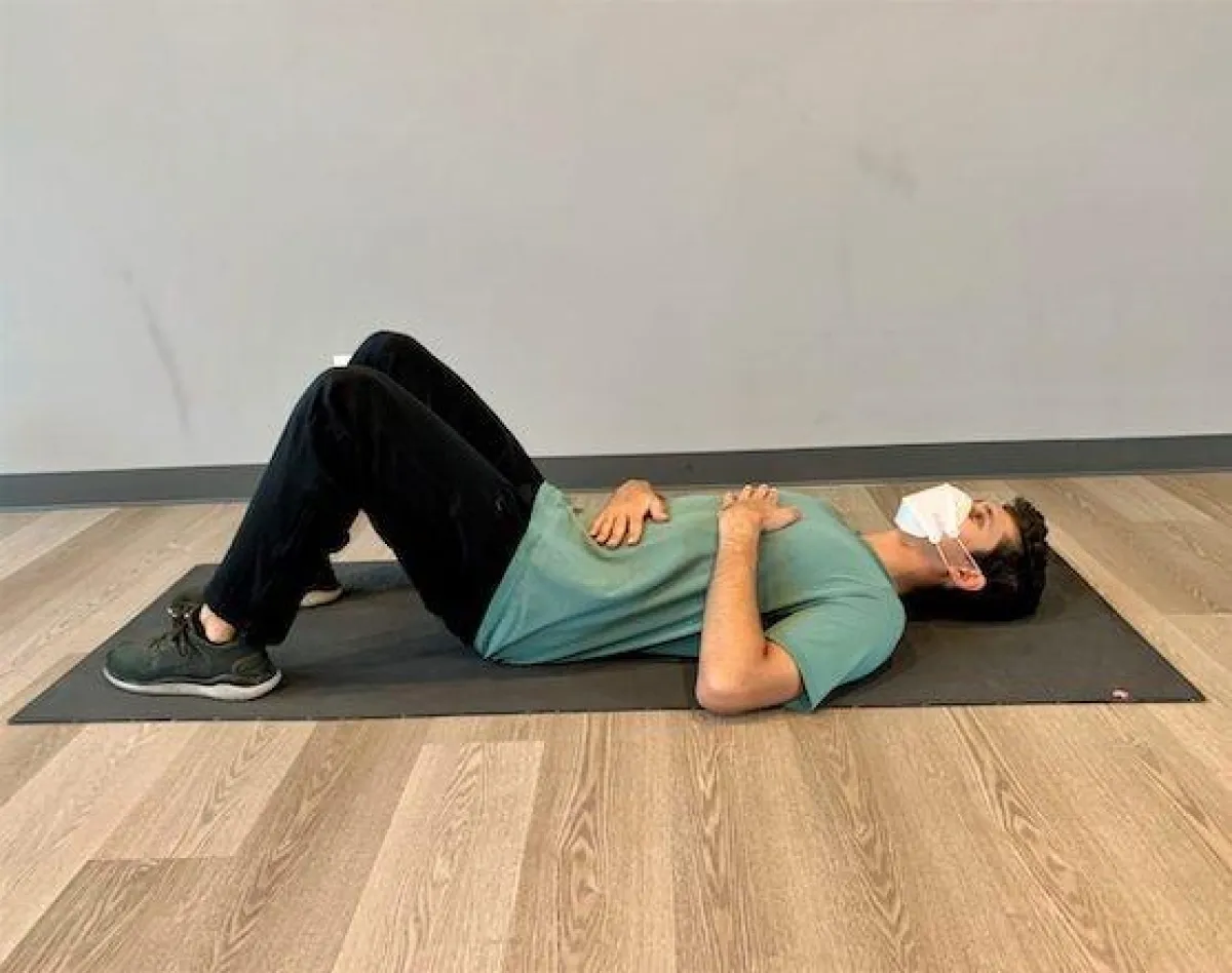 للقيام بالتمرين، اجلس أو استلق بوضعية الاسترخاء، ثم ضع طرف اللسان خلف أسنانك الأمامية العلوية، حافظ على استقامة ظهرك وأغمض عينيك، حاول التنفس بشكل طبيعي ثم ضع إحدى يديك على صدرك والأخرى على بطنك.