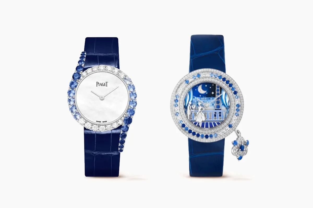 قدمت دار بياجيه Piaget، العديد من التصاميم الجذابة لساعات مرصعة بالألماس تليق بإطلالات الصيف، أعجبنا هذا التصميم الفاخر، المُصمم من عيار ١٨ قيراطاً مع علبة مرصّعة بأحجار الياقوت الأزرق والألماس، المرصعة ب ٢٠ ماسة من قطع البريانت و٢٢ ياقوتاً أزرق مع ميناء من عرق اللؤلؤ الأبيض، مع أبزيم مرصع ب ١٥ ماسة بوزن إجمالي ٦٠. ٠ قيراط