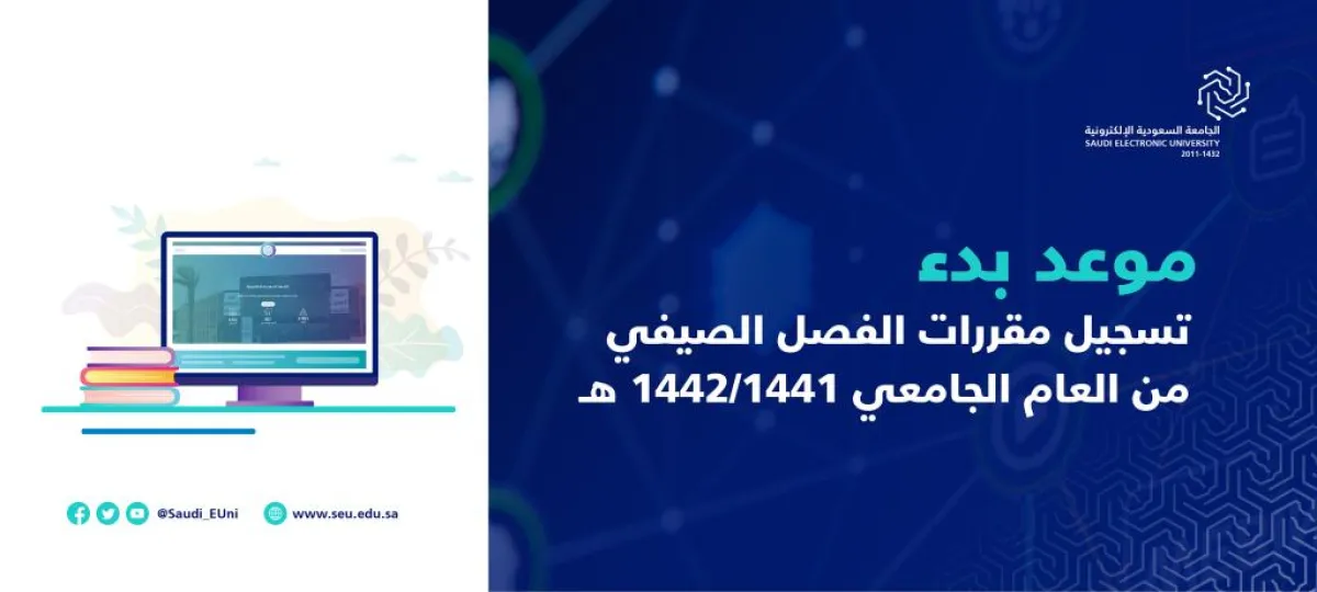 أعلنت الجامعة السعودية الإلكترونية بدء تسجيل مقررات مرحلة البكالوريوس للفصل الصيفي من العام الجامعي «١٤٤٢/١٤٤١ هـ» وقالت الجامعة، عبر حسابها الرسمي بموقع التواصل الاجتماعي تويتر، إن التسجيل سيكون ابتداء من ١٤٤٢/١٠/٧ هـ حتى ١٤٤٢/١٠/١٤هـ.