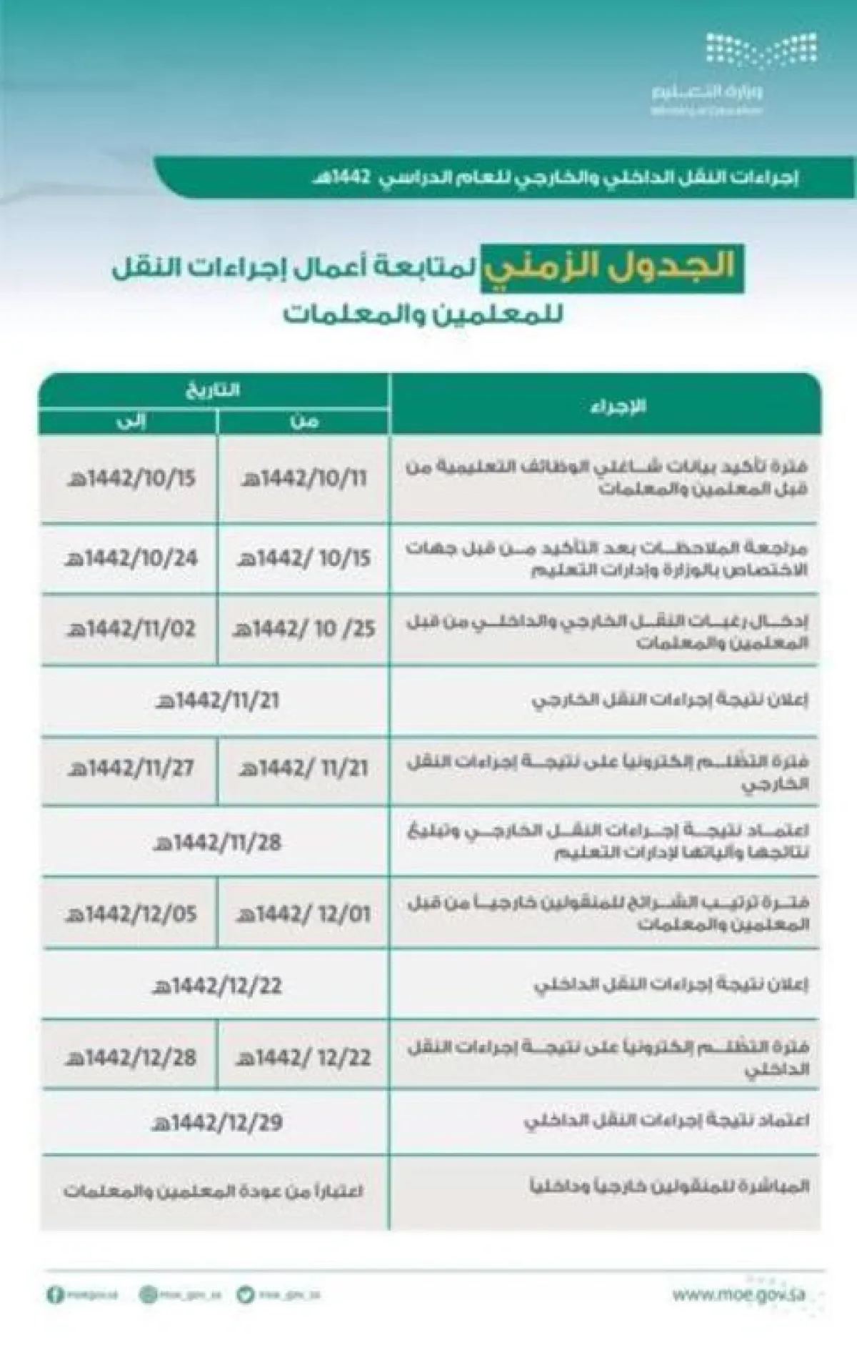 ووجهت وزارة التعليم بتشكيل لجنة مركزية بإشراف وكالة الوزارة للشؤون المدرسية وعضوية الجهات ذات العلاقة؛ لتتولى المتابعة والتنسيق والإشراف على عمليات تنفيذ واستيفاء إجراءات النقل الداخلي والخارجي، وإعداد التقارير اللازمة لذلك، إلى جانب تشكيل لجان في إدارة أو قسم شؤون المعلمين في إدارات التعليم لتنفيذ إجراءات النقل.