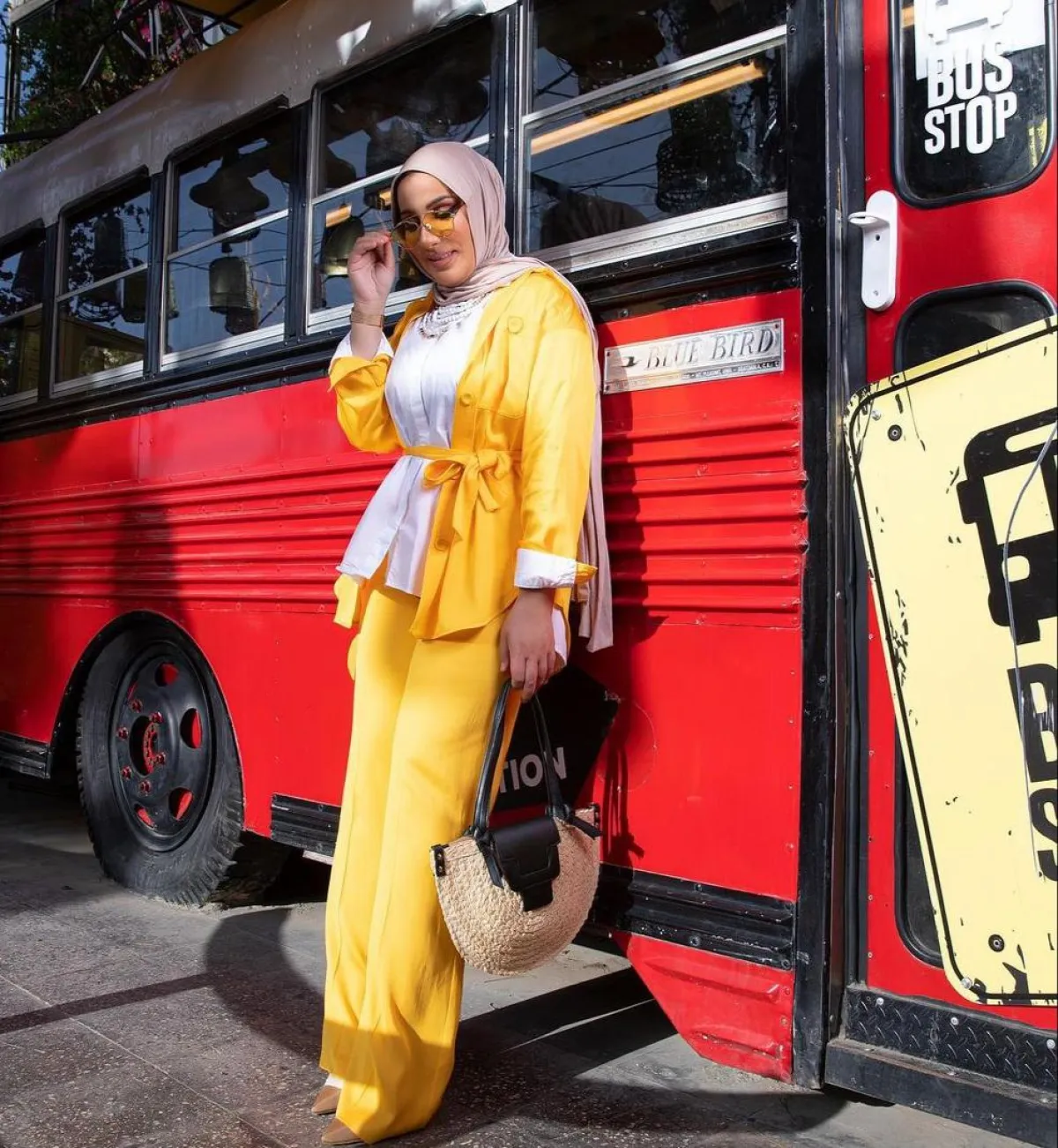 يُعَدُّ اللون الأصفر من الألوان الأكثر رواجاً لعام 2021، لذا أطلت نداء شرارة في مظهر عملي ناعم بمعطف وبنطلون واسع باللون الأصفر مع قميص أبيض مزين بقلادات من اللؤلؤ، وأكملت اللوك بحجاب بني، وحقيبة من القش المزين بقماش الجلد الأسود، لتمنحها أناقة يومية بسيطة.