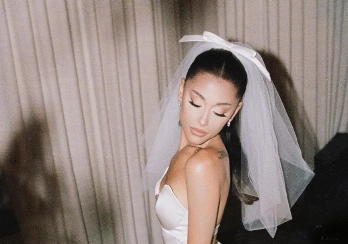 بدت "أريانا" مذهلة وهي تعرض شكلها النحيف في ثوب زفاف أبيض من الحرير الملائم للشكل،. وكانت ترتدي طرحة زفاف بيضاء تقليدية تعلوها فيونكة أنيقة وعصرية.