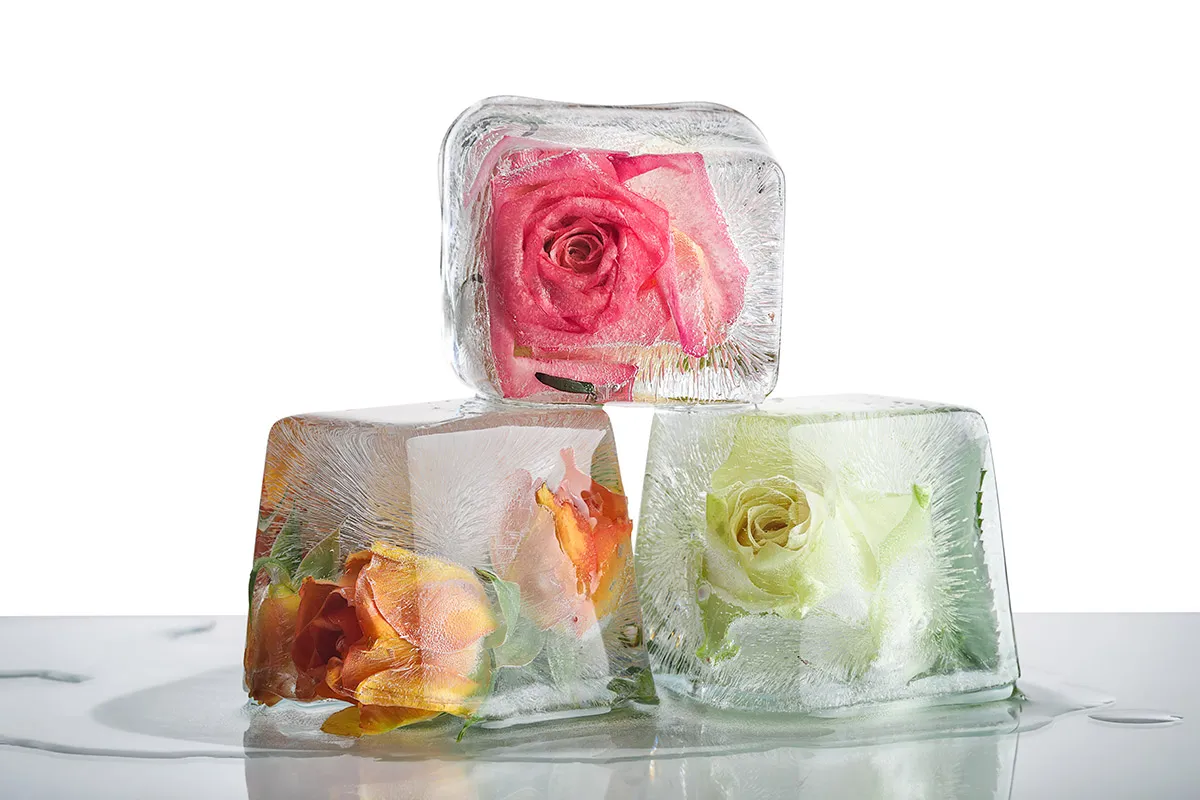 في وعاء، صبي ماء الورد النقي، وأضيفي إليه بتلات الورد الطازجة. اخلطي المكونات قليلاً، وصبيها في قالب مكعبات الثلج، وضعيها مباشرة في الثلاجة الى أن تتجمد بالكامل.