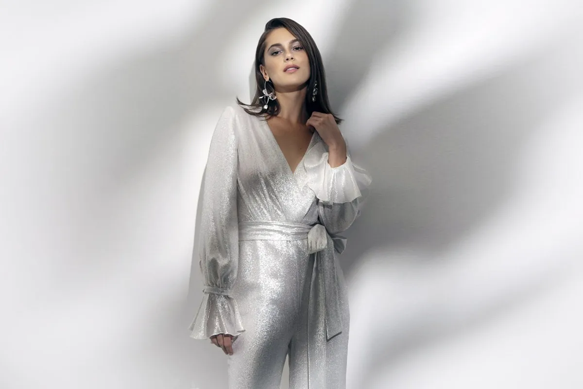 لتصميم أكثر فخامة وجاذبية، قدمت ماركة Alexandra Grecco هذا الموديل لجمبسوت باللون الفضي اللامع، صُمم من القماش اللامع، بتوب ذي أكمام طويلة وواسعة وأساور من الكشكش، مع فتحة صدر على شكل حرف V، أما البنطلون فجاء واسعاً بتصميم الشارلستون، مع حزام على الخصر لعمل فيونكة بنفس لون وقماش الجمبسوت.