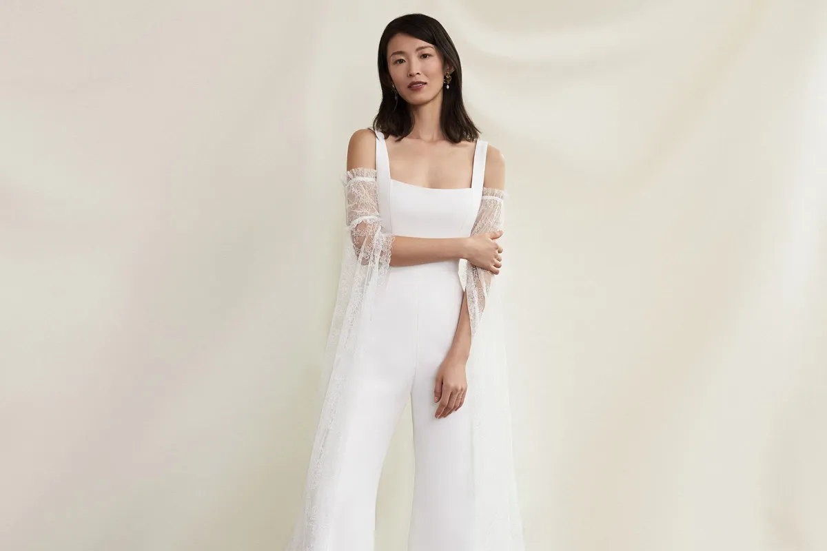 لتصميم أكثر فخامة يناسب العروس التي تبحث عن إطلالة جذابة وراقية في ليلة زفافها، قدم المصمم نعيم خان Naeem Khan هذا الموديل المميز، لجمبسوت أنيق صُمم من توب بتصميم إغريقي أنيق ذي رقبة عالية وصدر بتصميم الكشكش وظهر مكشوف، أما البنطلون فجاء بتصميم ضيق مع خصر عالٍ وعريض، وتنورة إضافية صُممت من القماش المنفوش، منحت الجمبسوت إطلالة أكثر جاذبية وفخامة.