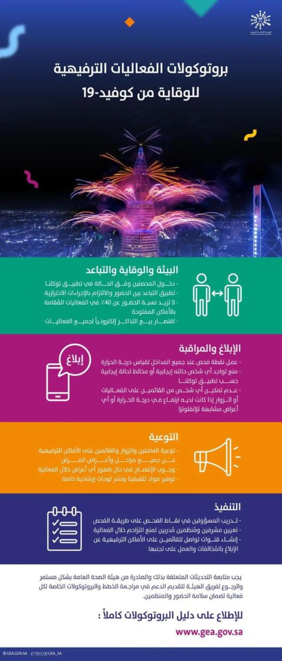 أعلنت الهيئة العامة للترفيه عن عودة الفعاليات الترفيهية وذلك وفقاً لبروتوكولات معتمدة من هيئة الصحة العامة (وقاية)، وذلك للوقاية من فايروس كورونا (كوفيد19)، متضمنة الاشتراطات الخاصة بمنظمي الفعاليات والزوار لتطبيق الإجراءات الاحترازية عند إقامة الفعاليات الترفيهية. وتشتمل البروتوكولات على أربعة محاور رئيسية هي: البيئة والوقاية والتباعد، الإبلاغ والمراقبة، التوعية، التنفيذ.