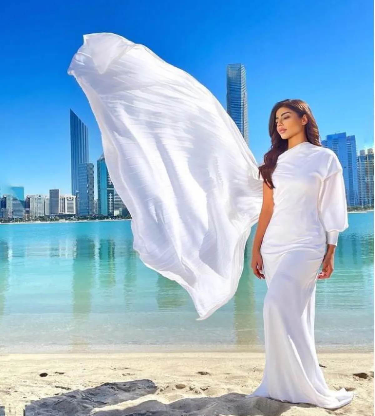 اختارت مهيرة عبد العزيز عباءة بيضاء مطرزة بمهارة حرفية عالية وارخت شعرها المتموج على كتفيها.