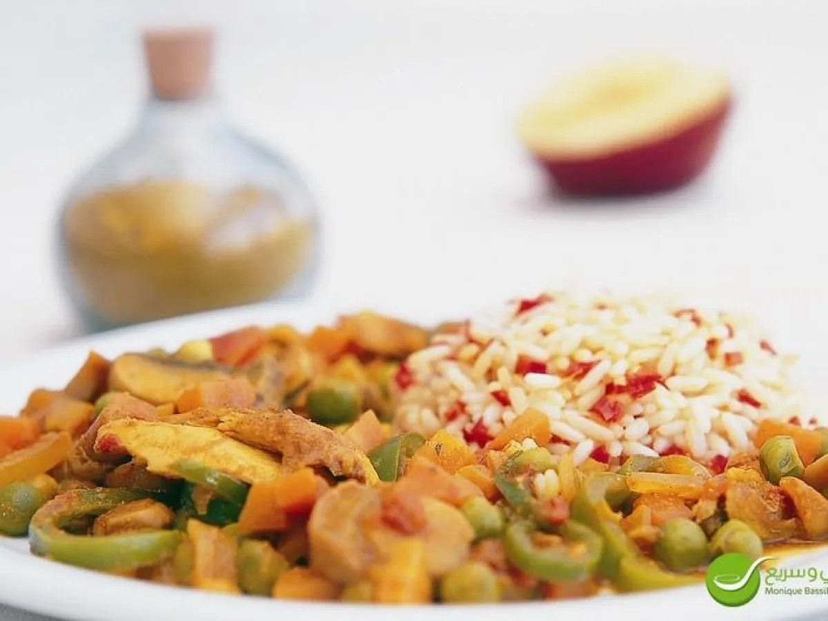 يمكن زيادة نصف فليفلة حمراء مفرومة ناعمة و 1 ملعقة طعام من الكاري على الأرزّ قبل زيادة الماء لتلوينه.