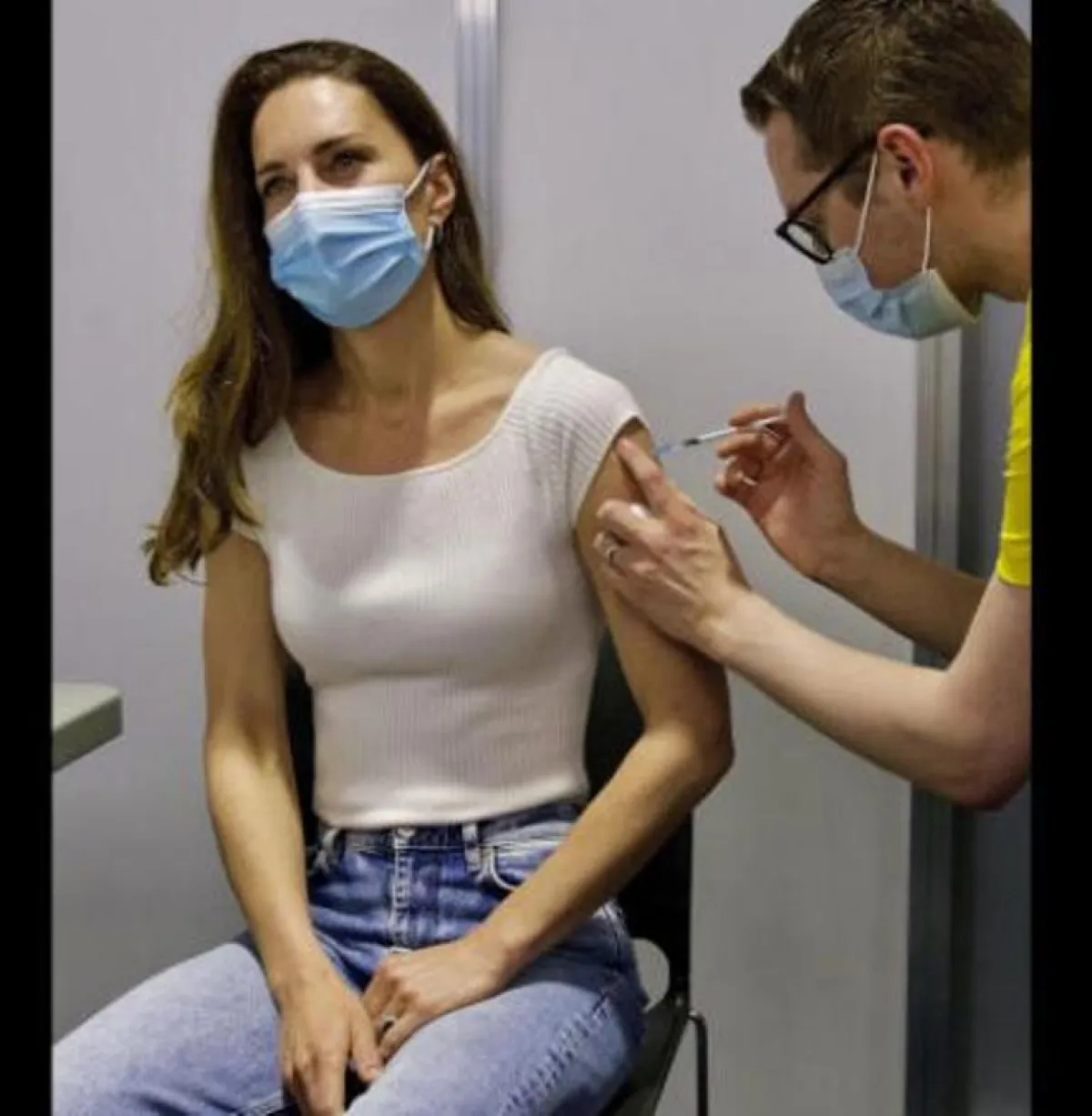وظهرت كيت ذات الـ39 عاما وهي ترتدي قناع وجه وسترة بيضاء وبنطلون جينز، وتم التقاط الصورة وتتلقى الحقنة في ذراعها، وردًا على تغريدة قصر كنسينجتون في لندن