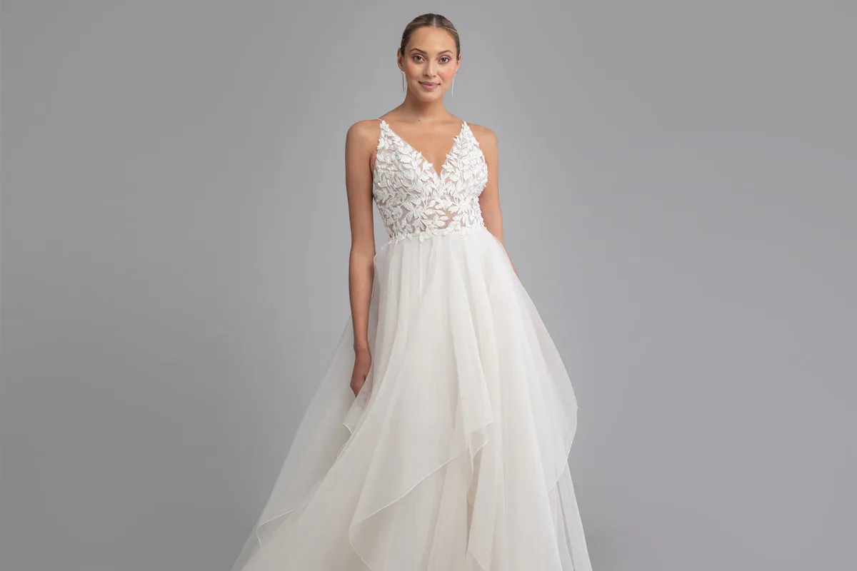 برزت صيحة الفساتين التول المنفوشة هذا العام، فقدمت ماركة Jenny Yoo هذا التصميم لفستان ناعم يبرز أنوثتك في حفل زفافك، المُزيّن من الورود والمُصمم من الشيفون والدانتيل عند الصدر، وجاءت حمالات الفستان عريضة.