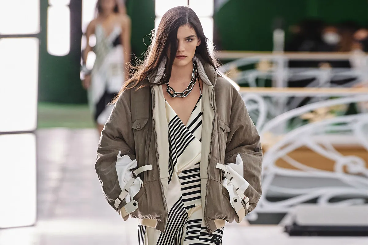 إذا كنتِ تبحثين عن فستان مناسب للذهاب إلى الشاطئ، لديكِ هذا التصميم الأنيق من لويس فويتون Louis Vuitton المُصمم من القماش المقلّم بخطوط من اللونين الأبيض والأسود، بالإضافة إلى ياقة على شكل حرف V وقد تم تنسيق سترة بومبر معها.