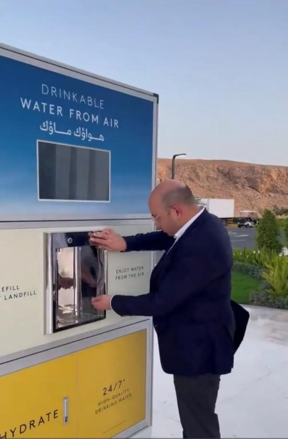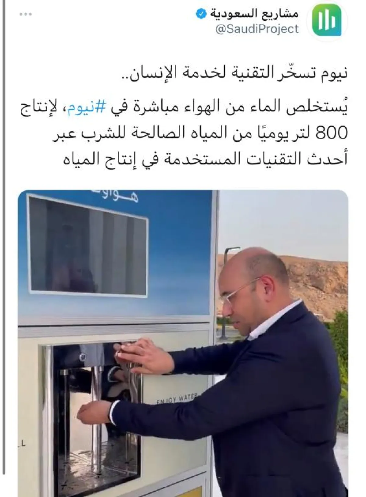 نشر حساب "مشاريع السعودية" مقطع فيديو للرئيس التنفيذي لشركة ماجد الفطيم العقارية، أحمد جلال إسماعيل، لاستخراج الماء من الهواء في مدينة نيوم.