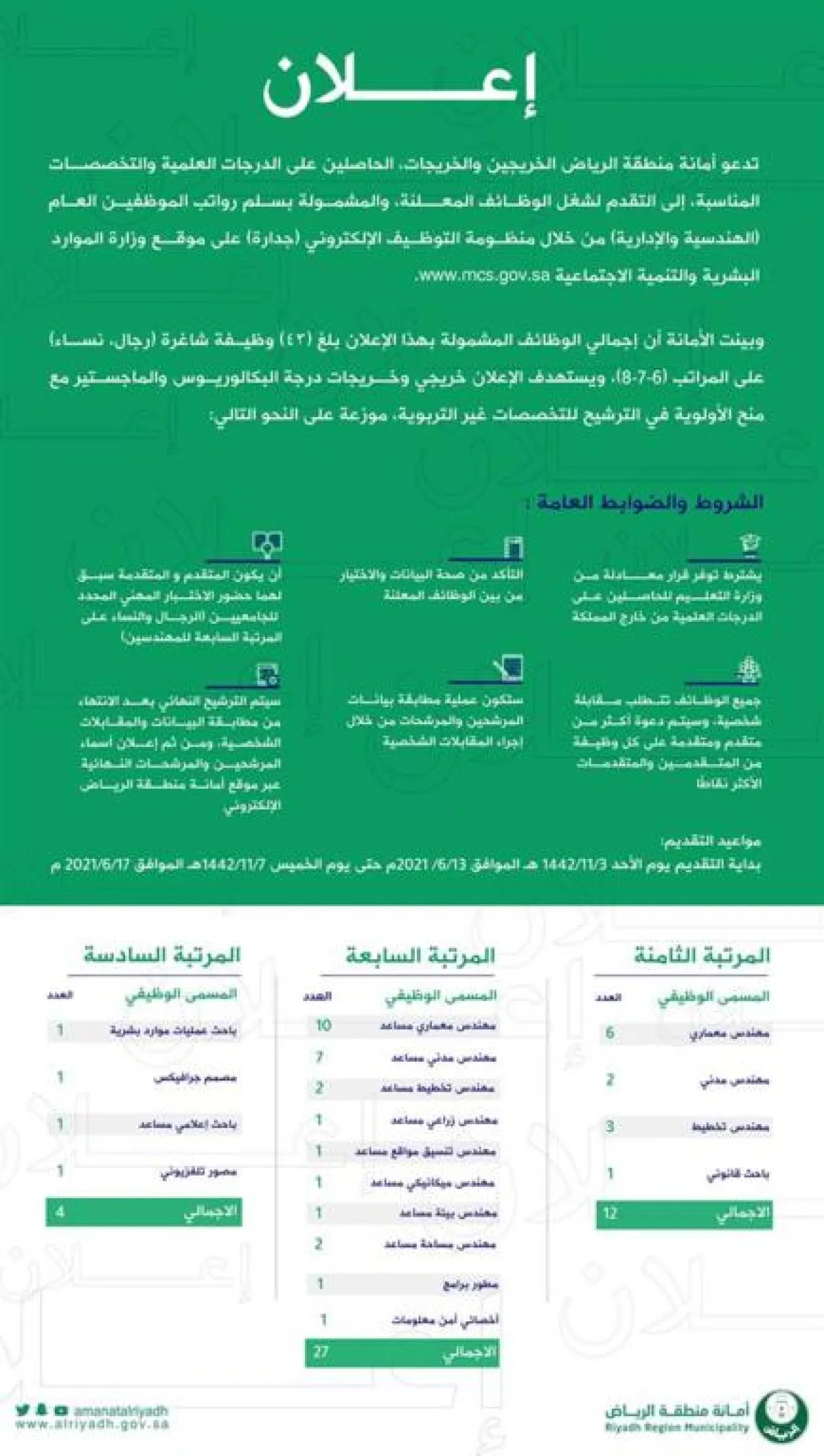 أعلنت أمانة منطقة الرياض حاجتها لشغل 43 وظيفة في مختلف التخصصات الهندسية والإدارية، من حملة البكالوريوس والماجستير، والمشمولة بسلم رواتب الموظفين العام، على المراتب (6- 7- 8).