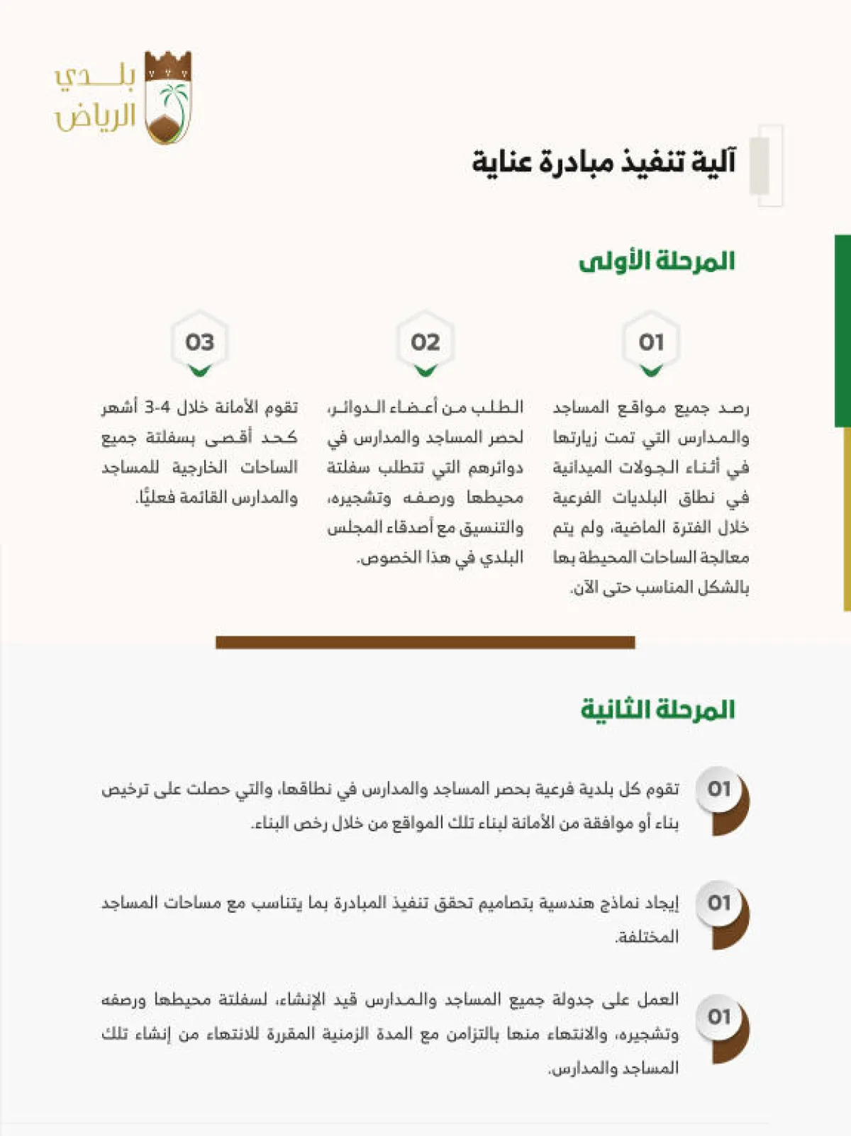 ويذكر أن المبادرة تتضمن مرحلة لاحقة تستهدف المساجد والمدارس قيد الإنشاء، لتطبيقها عليها بالتنسيق مع إدارة تعليم الرياض والبلديات الفرعية لحصر المساجد والمدارس قيد الإنشاء في نطاقها، والعمل على جدولة هذه المساجد والمدارس، لسفلتة محيطها ورصفه وتشجيره، والانتهاء منها بالتزامن مع المدة الزمنية المقررة للانتهاء من إنشائها.