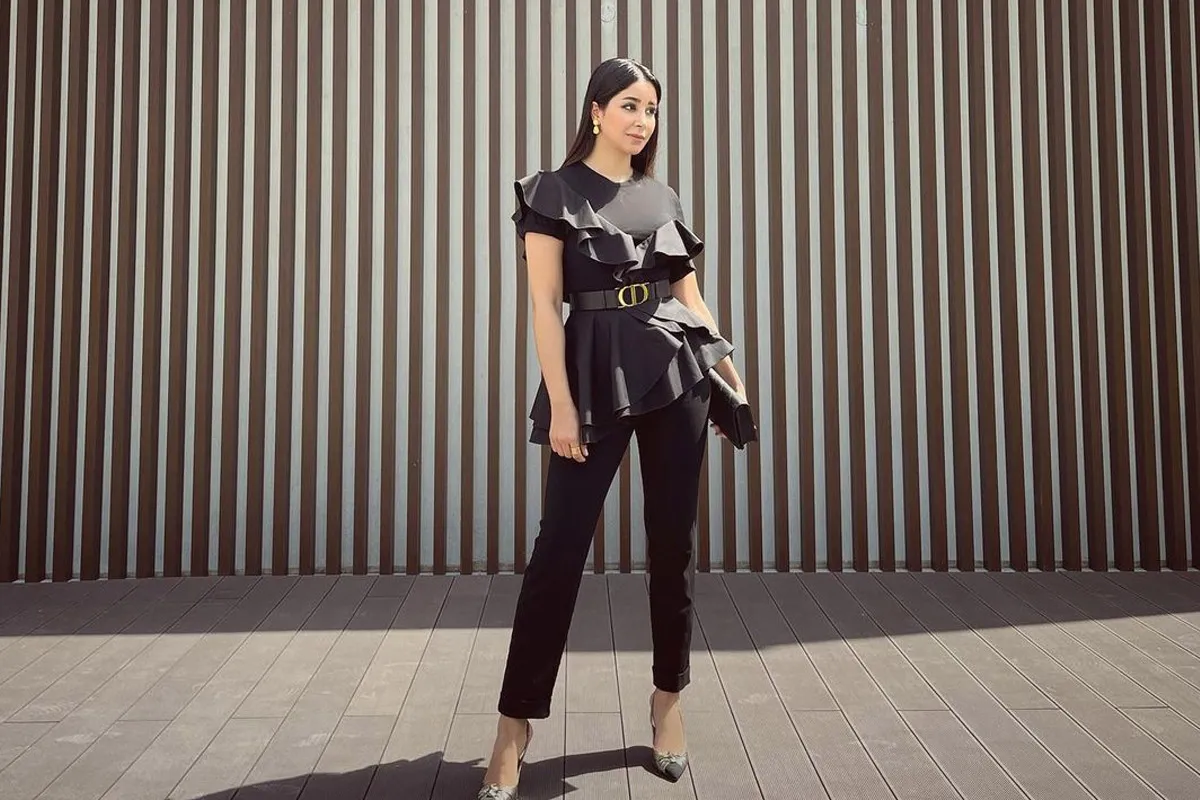 ارتدت النجمة أسيل عمران طقماً عملياً باللون الأسود مع بلوزة مُصممة بالكشاكش من حواف البلوزة ومن الأكتاف.