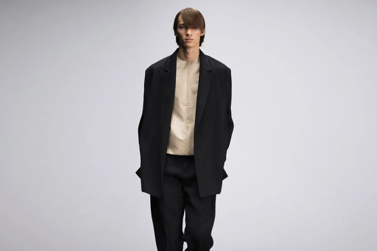 رغم اختلاف صيحات وألوان البدلات الرجالية، إلا أنه لا يمكن الاستغناء عن البدلة السوداء داخل خزانة كل رجل، لذا قدمت ماركة دنهل Dunhill بدلة سوداء بتصميم عصري، صُممت من بليزر طويل وواسع باللون الأسود، بدون أي جيوب أو أزرار للإغلاق، مع بنطلون بتصميم كلاسيكي واسع بنفس لون البليزر، وتيشرت صُمم من قماش التفتة ذي رقبة دائرية عالية باللون البيج الفاتح.
