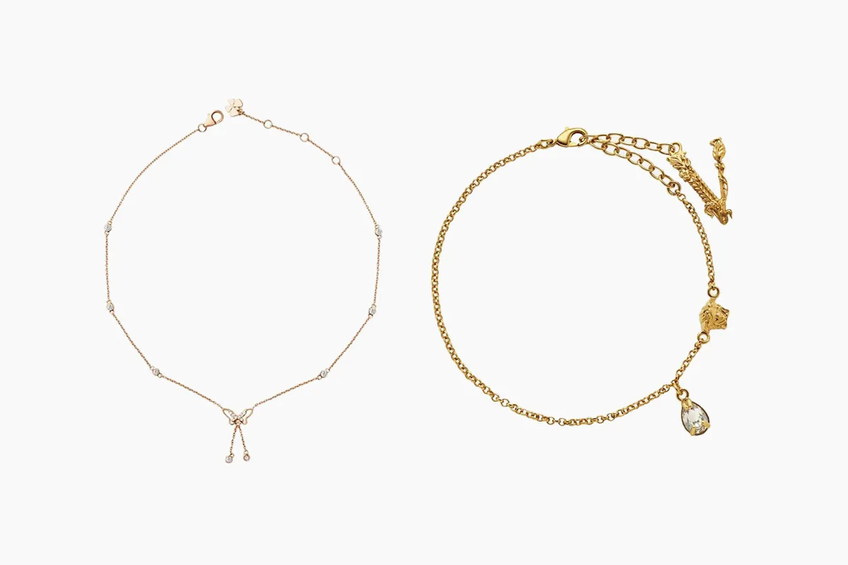 قدمت ماركة فيرساتشي Versace العديد من التصاميم الراقية والجذابة لموديلات خلخال ذهب لصيف 2021، أعجبنا منها هذا التصميم الناعم لخلخال ذهب مزين بالكريستال على شكل كمثرى، مع شعار الماركة الذي صُمم بالكامل من الذهب.