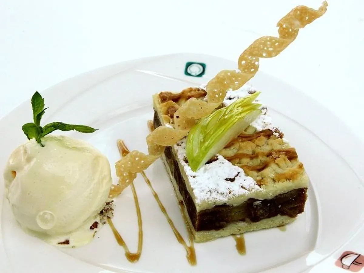 6- يعاد القالب مجدداً إلى الفرن لمدّة 45 دقيقة، ثم يقطّع ويقدّم مع الآيس كريم والتفاح المقطع.