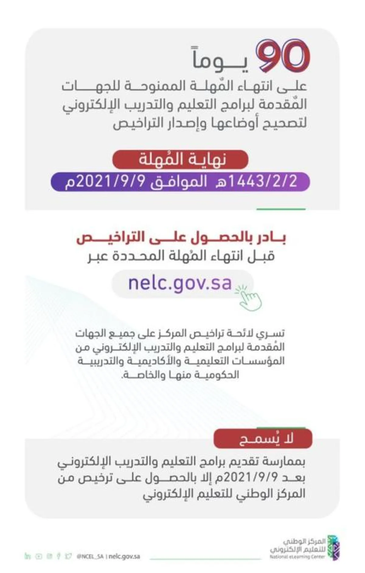 نشر المركز الوطني للتعليم الإلكتروني، عبر حسابه الرسمي على موقع التدوينات المصغر "تويتر"، انفوغراف، جدد من خلاله تذكير جميع جهات التعليم العام والعالي والمؤسسات التدريبية ومختلف الجهات المقدمة لبرامج التعليم أو التدريب بالنمط الإلكتروني، بمسارعة التقديم للحصول على التراخيص اللازمة لتمكينها من مزاولة وتقديم أنشطة التعليم الإلكتروني قبل نهاية المهلة المحددة بعد 90 يومًا.