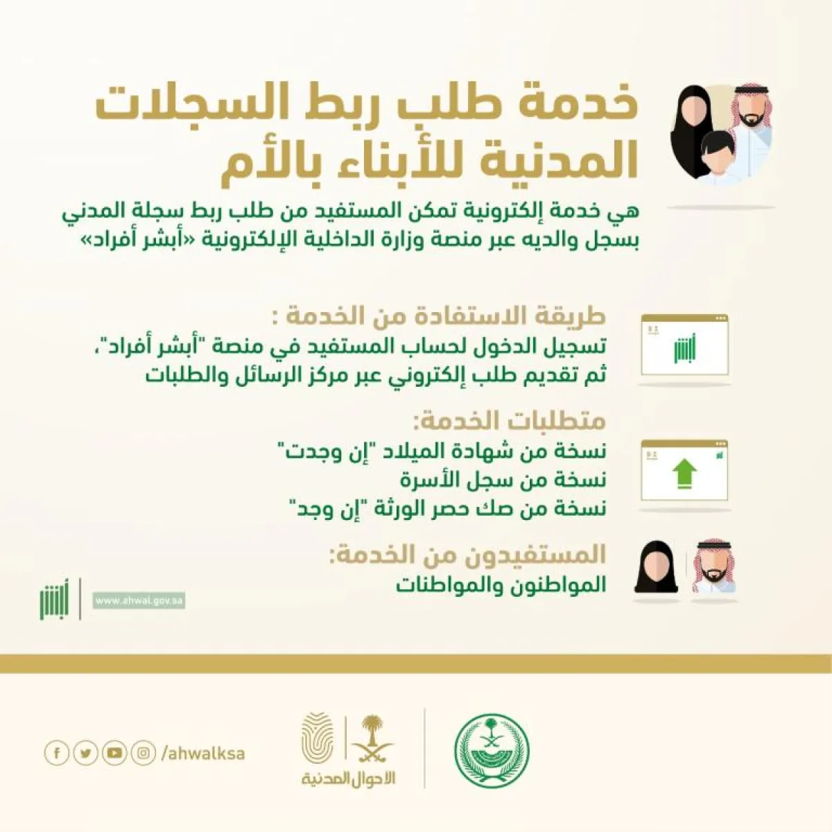 وأضافت أن الخدمة تتطلب نسخة من شهادة الميلاد "إن وُجدت"، ونسخة من سجل الأسرة، وكذلك نسخة من صك حصر الورثة "إن وُجد"، مبينة أن المستفيدين من الخدمة هم المواطنون والمواطنات.