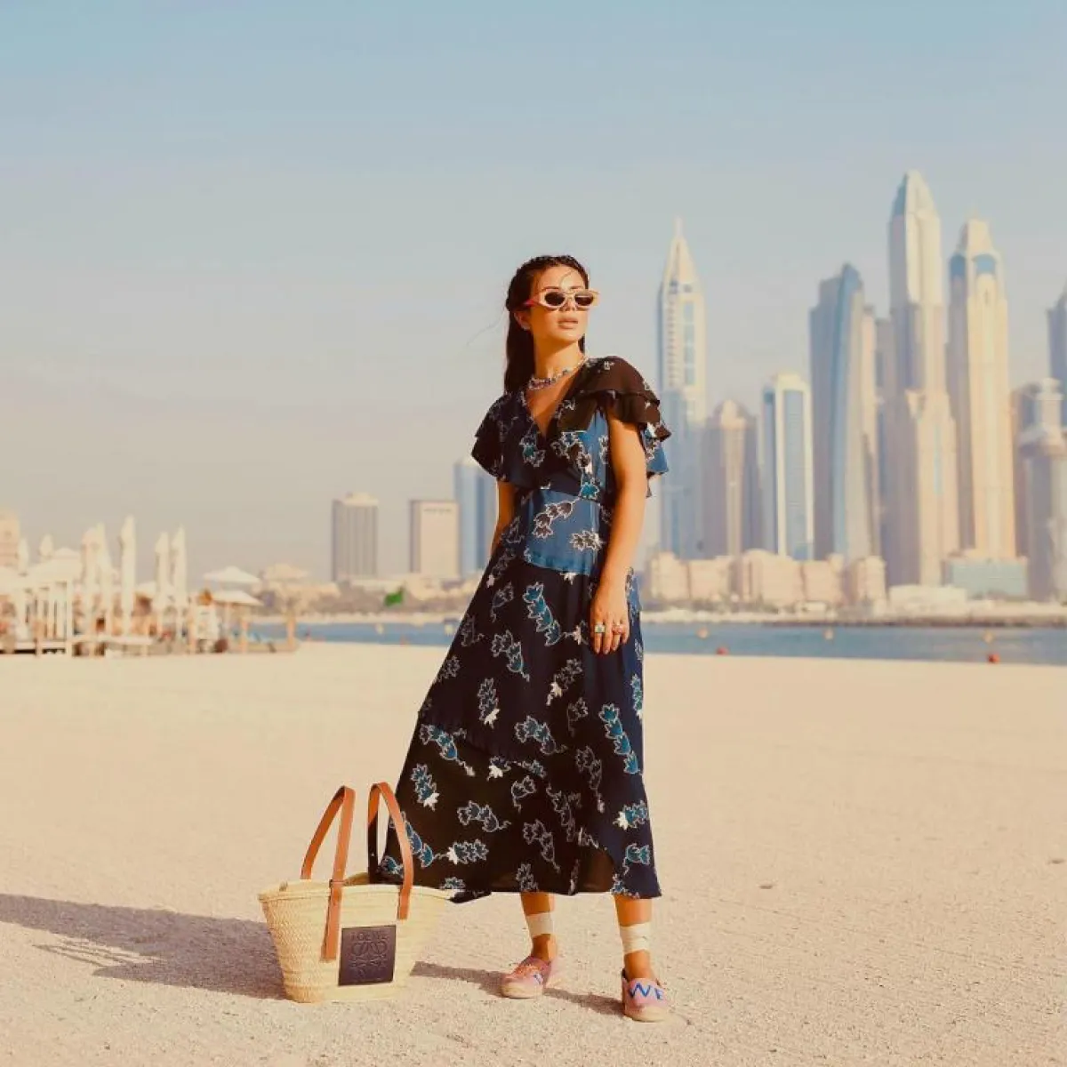 في أثناء وجود ديما الأسدي على أحد شواطئ دبي، اعتمدت فستاناً طويلاً مُصمَّماً بقصّة كلاسيكية مع أكمام من الكشكش وعدة طبقات، وجاء الفستان مُزيّناً على شكل سنابل باللون الأزرق الداكن واللون الكُحلي، وعند الخصر بشكل عريض باللون الأزرق الفاتح، وجزء من الأكمام باللون الأزرق أيضاً.