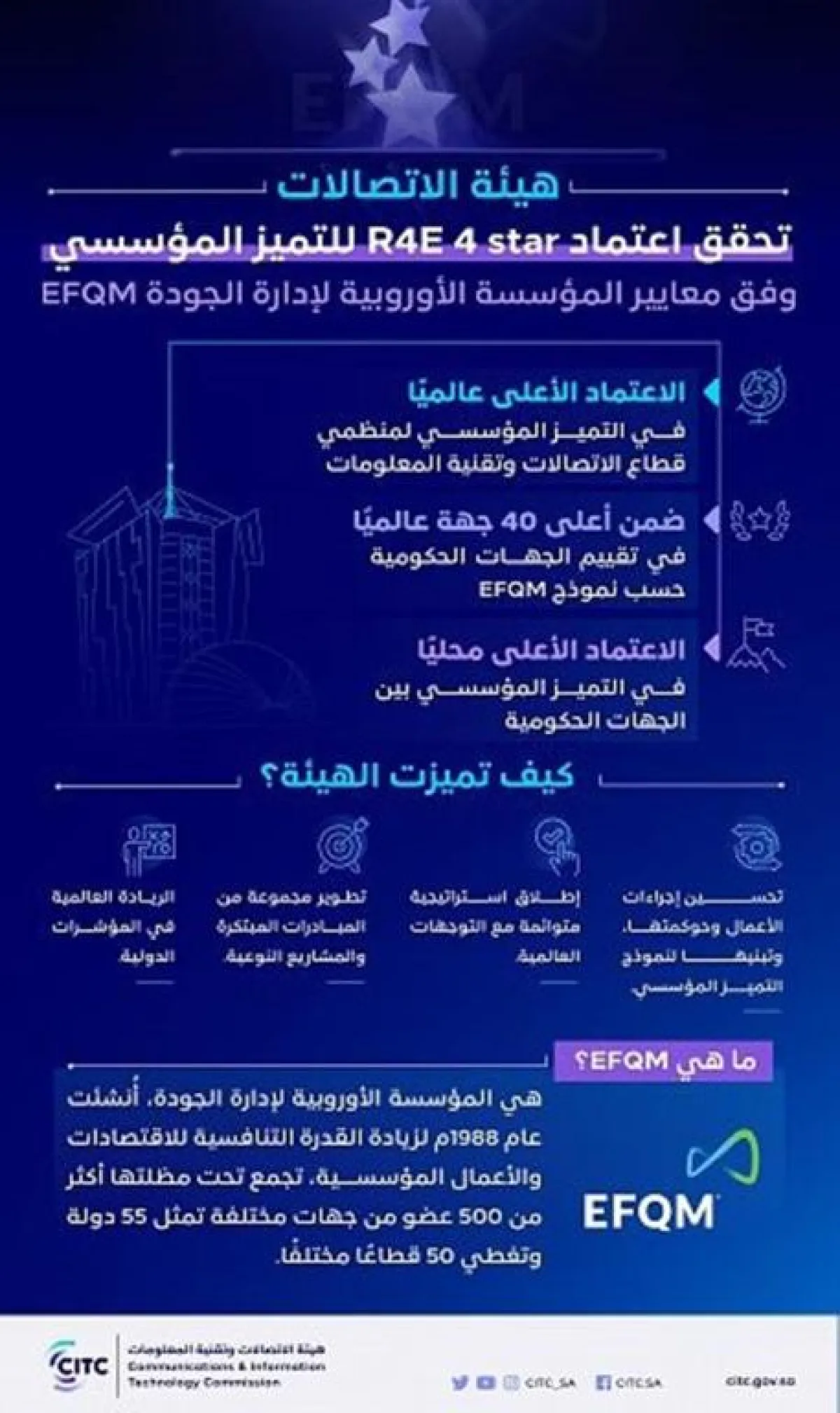 في إنجاز جديد يضاف لإنجازات المملكة العربية السعودية حصلت هيئة الاتصالات وتقنية المعلومات على اعتماد التميز المؤسسي (Recognized For Excellence 4 Stars) من المؤسسة الأوروبية لإدارة الجودة EFQM, وذلك نظير إطلاقها لمجموعة من المبادرات النوعية التي ساعدت في تحسين إجراءات الأعمال وحوكمتها، وتبنيها لنموذج التميز المؤسسي، واستيفائها لمعايير تقييم الممكنات و النتائج المدرجة في نموذج التقييم المرتبط بمستوى (4 Star) التي تركّز على كفاءة التشغيل والتميز في نتائج الأداء المؤسسي.