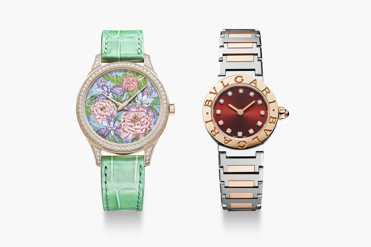 قدمت ماركة شوبارد Chopard هذا التصميم الراقي لساعة يد بطلاء المينا، تناسب أجواء الصيف، حيث صُممت الساعة بعلبة دائرية من الذهب الوردي مُرصعة بالألماس بوزن 1.83 قيراطاً، مع ميناء مزين بطلاء المينا بتصميم ورود ملونة جذابة، فيما صُمم سوار الساعة من جلد التمساح الأخضر.