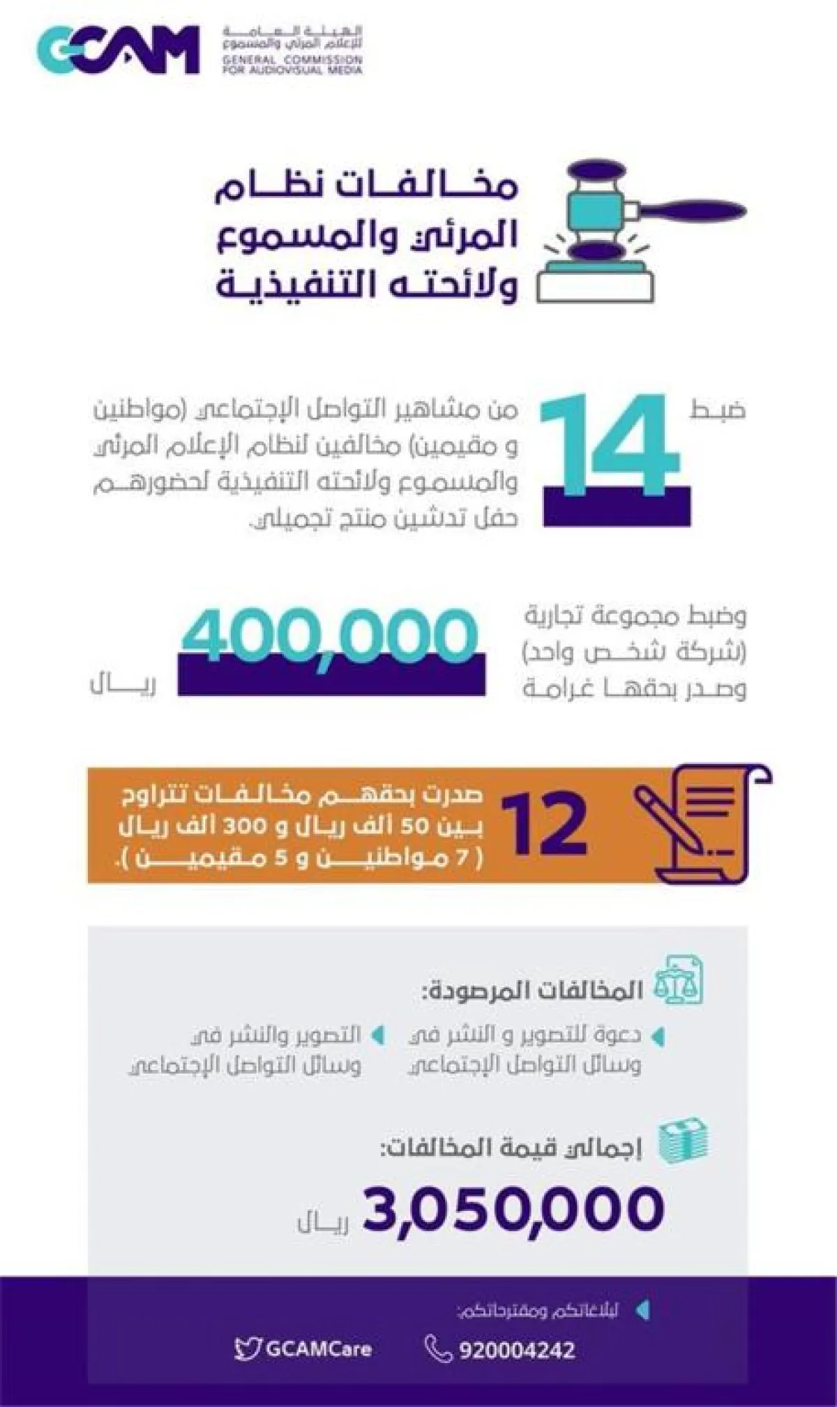 أصدرت الهيئة العامة للإعلام المرئي والمسموع أمس (الأحد)، عقوبات تصل إلى أكثر من 3 ملايين ريال بحق عدد من مشاهير التواصل الاجتماعي ومجموعة تجارية، لمخالفتهم الإجراءات الاحترازية ونظام الإعلام المرئي والمسموع ولائحته التنفيذية، وذلك أثناء حفل تدشين منتج تجميلي.