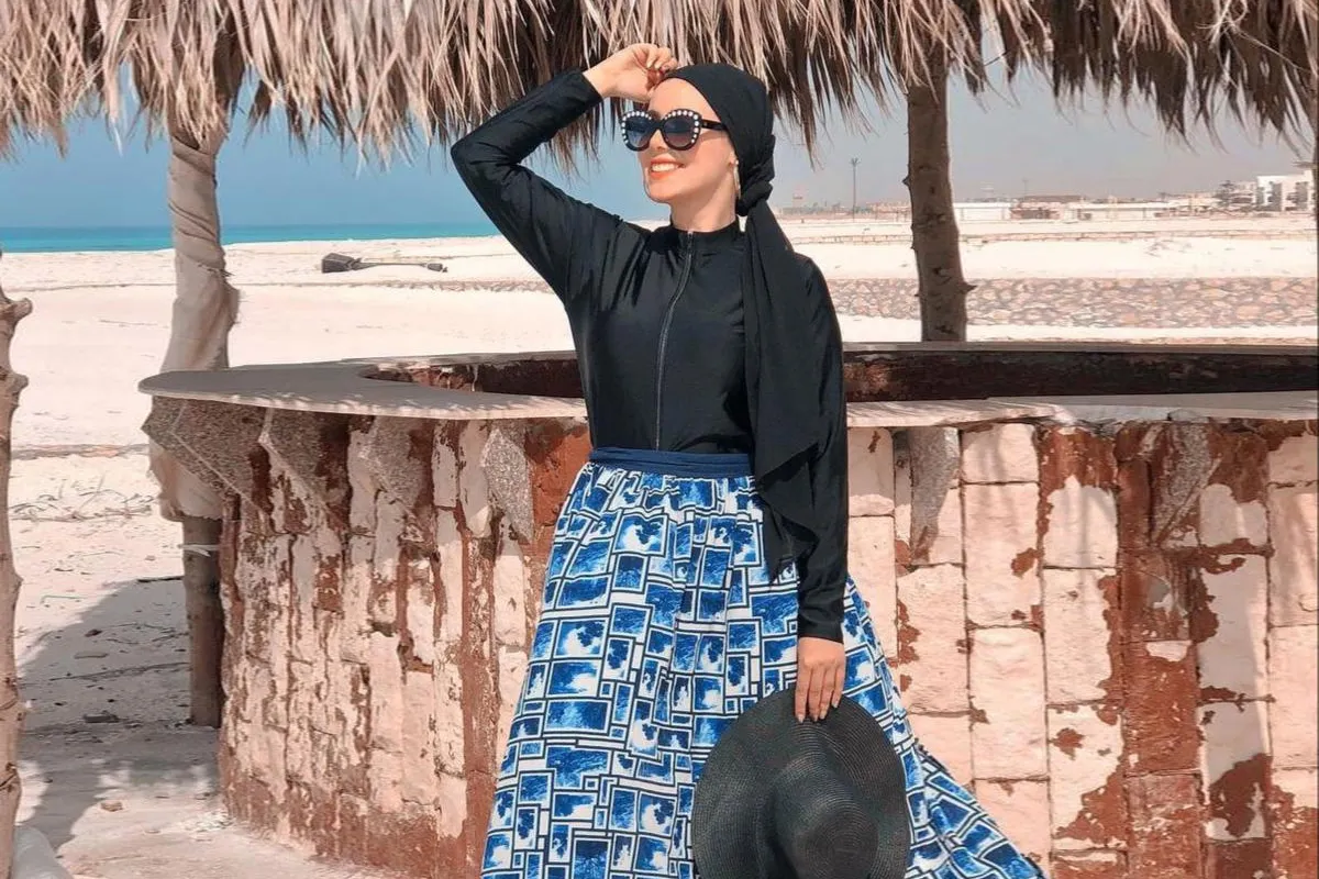 إن كانت ملابس السباحة الخاص بكِ تتميز بتصميم ذي قَصَّة مستقيمة أو أشبه بالجمبسوت، فلا تترددي في اختيار الكاش مايوه الأشبه بالشال ليتم ارتداؤه بطريقة التنورة الواسعة؛ للحصول على مظهر عصري جذاب على أسلوب مدونة الموضة المصرية، آية ممدوح، ولكن اعتني باختيار الألوان لتظهري بأسلوب أنيق. وعن آية ممدوح فقد اعتمدت ملابس السباحة باللون الأسود مع كاش مايوه أزرق مطبع باللون الأبيض والأسود، وأكملت مظهرها بحجاب وقبعة للبحر باللون الأسود، مع نظارة شمسية سوداء مزينة بالستراس.