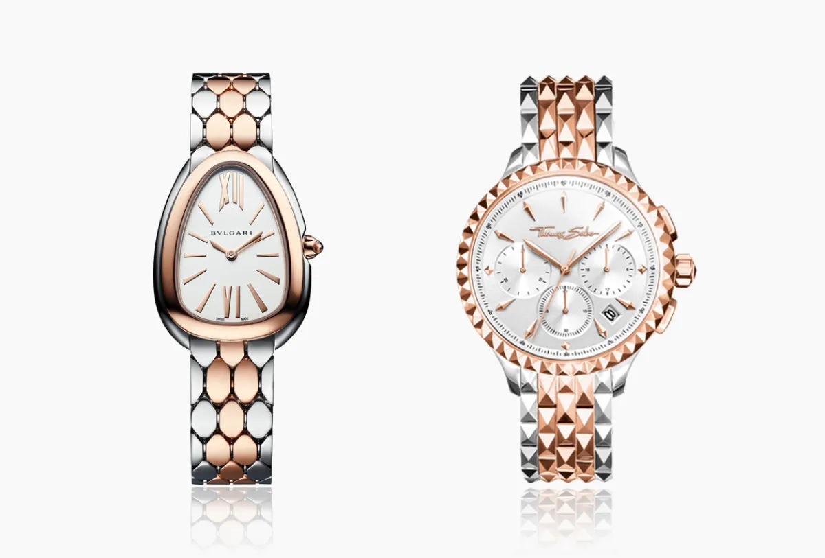 لتصميم عصري أكثر جاذبية لساعات ذهب وفولاذ، يُمكنكِ الاستعانة بهذا التصميم المميز لساعة من ماركة توماس سابو Thomas Sabo، مُصممة من علبة دائرية من الذهب الوردي، مع عقارب من الذهب الوردي، وسوار مُصمم من الفولاذ مع الذهب الوردي، بتصميم عصري وجذاب.