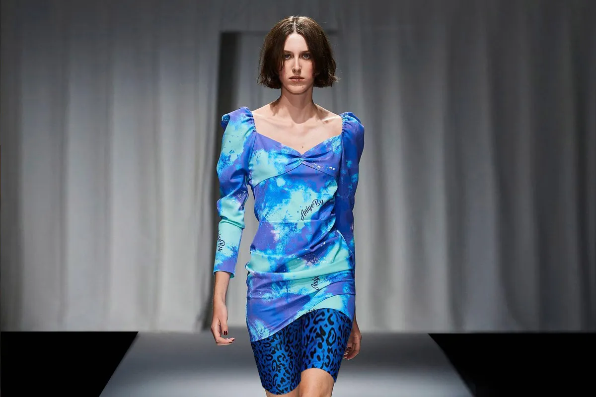 قدمت ماركة Aniye By العديد من التصاميم الجذابة والعصرية لفساتين بنقشة التاي داي، اعجبنا منها هذا التصميم، لفستان قصير بدرجات اللون الأزرق، صُمم بأكمام طويلة وأكتاف منفوشة، مع تنورة قصيرة بتصميم A line، تم تنسيقها مع شورت قصير باللون الأزرق الداكن.