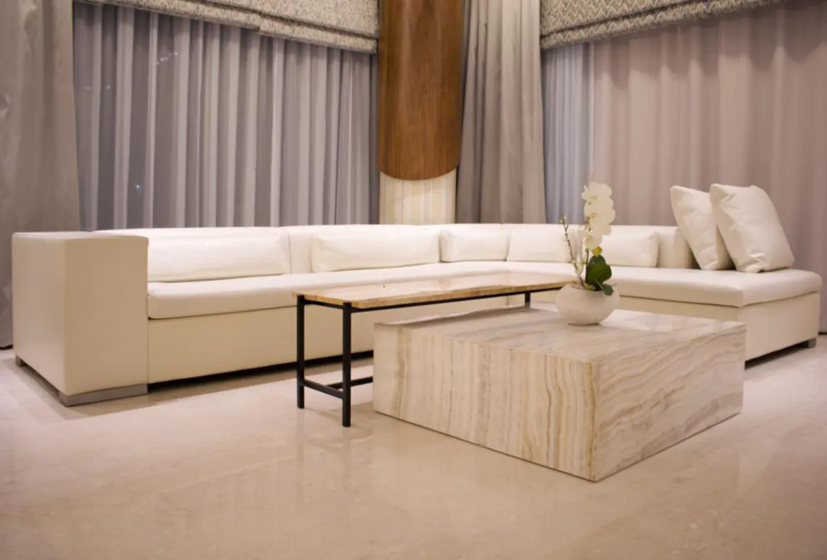 5 تغطى الأرضية في الصالة بالرخام وليس الباركيه، لإطلالة لا تخلو من جاذبيّة.