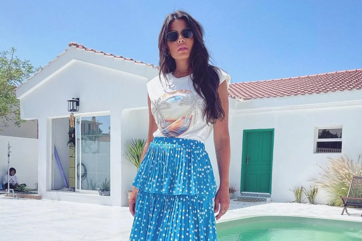 كما اختارت تنورة طويلة منقطة زرقاء مزدانة بالكشاكش ومصممة بقصة مستقيمة مع بلوزة قطنية مطبعة وانتعلت الحذاء العالي من زارا.