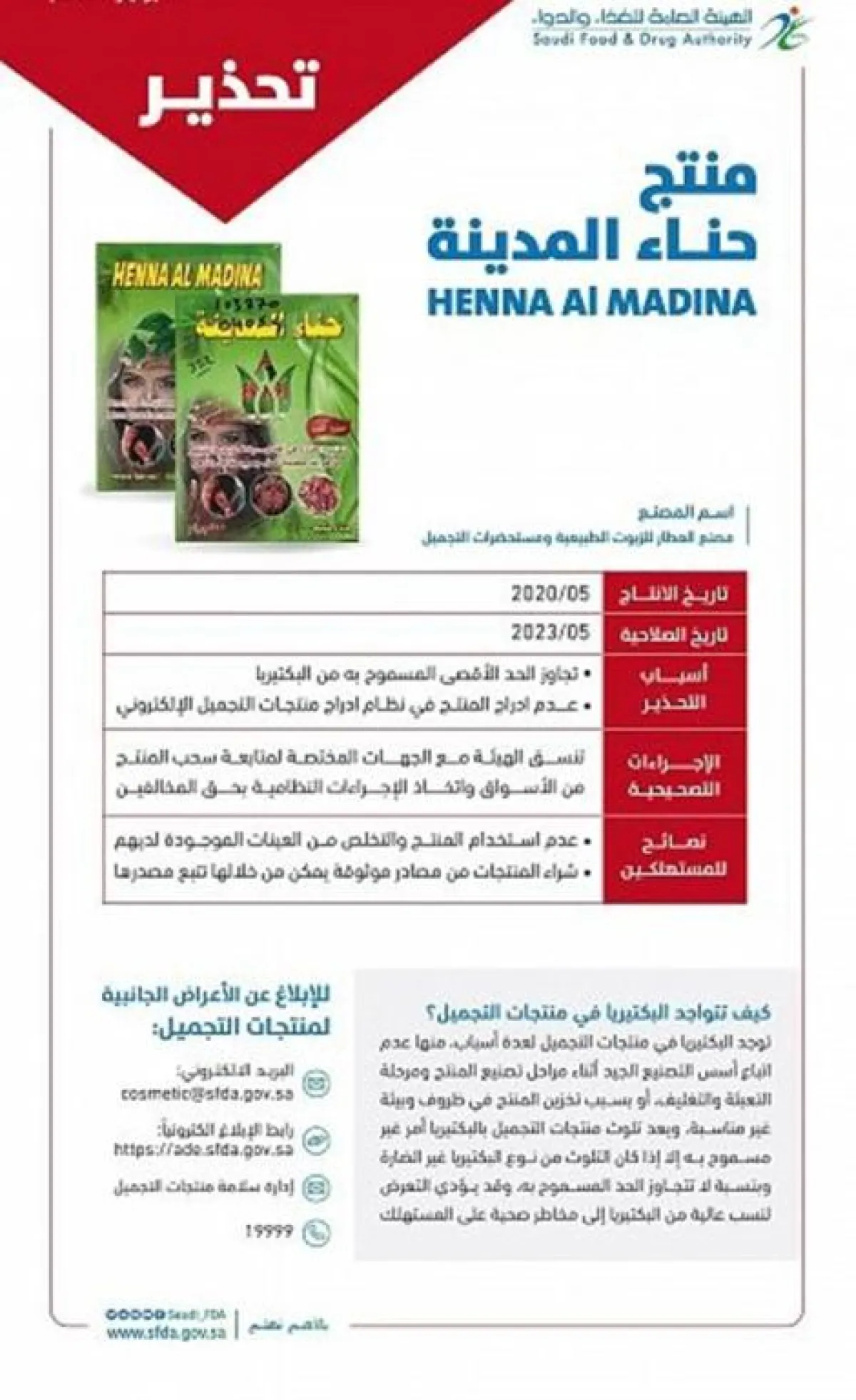 نبهت الهيئة العامة للغذاء والدواء المستهلكين إلى تجنب استخدم منتج تجميلي يحمل اسم "حناء المدينة"، وذلك بسبب احتوائه على نسبة عالية من البكتيريا تجاوزت الحد الأقصى المسموح به، وعدم إدراجه في نظام إدراج منتجات التجميل الإلكتروني.