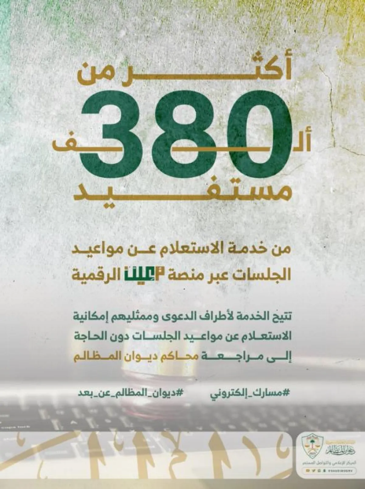 مكّنت خدمة الاستعلام عن مواعيد الجلسات من خدمة أكثر من 380 ألف مستفيد عبر منصة "معين" الرقمية بديوان المظالم.