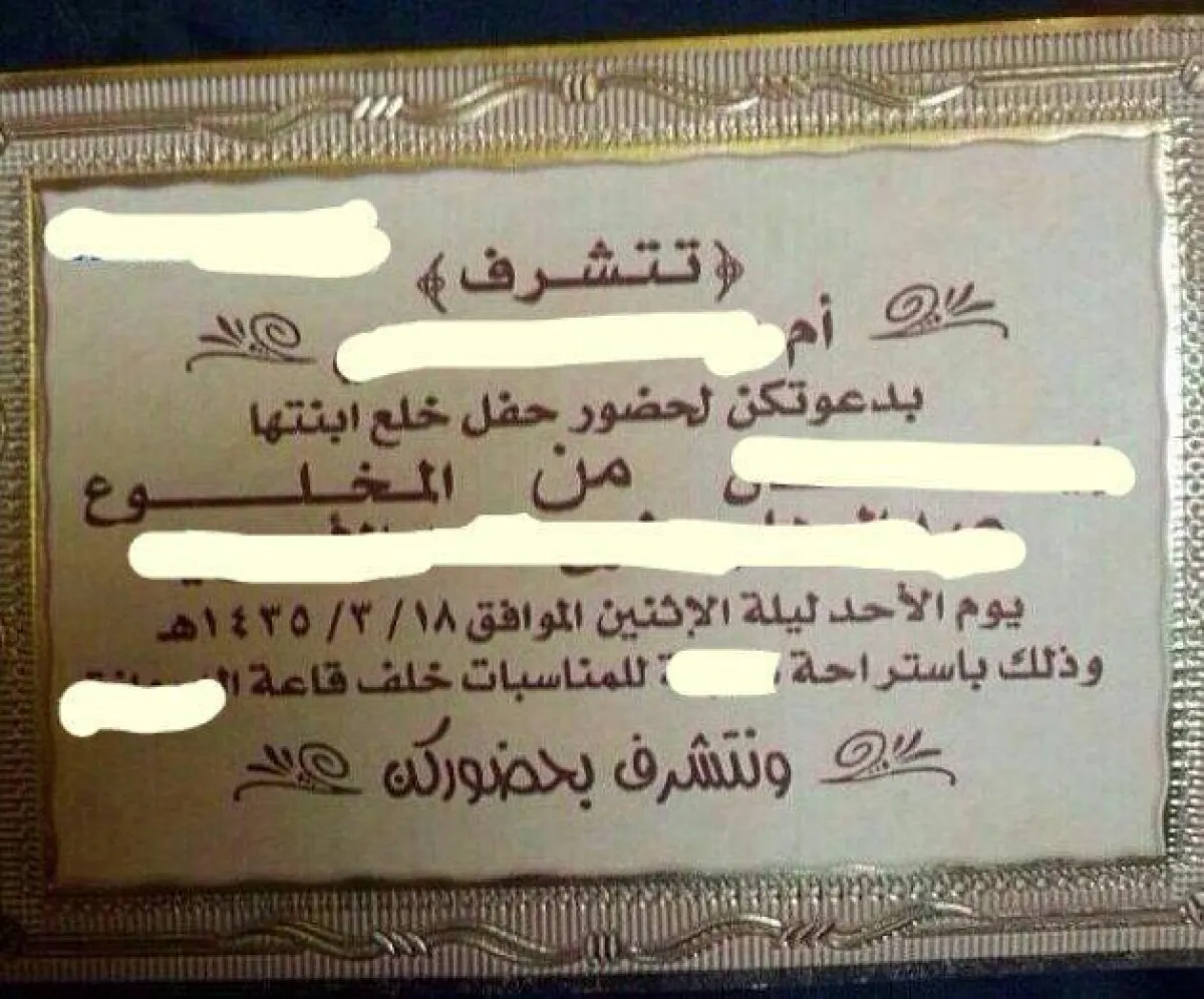 حيث احتوت دعوة الاحتفال بـ"الخلع" اسم زوج ابنتها كاملاً واصفةً إياه بـ"المخلوع"، واسم الأم التي أطلقت على نفسها أم هادي واسم إبنتها.