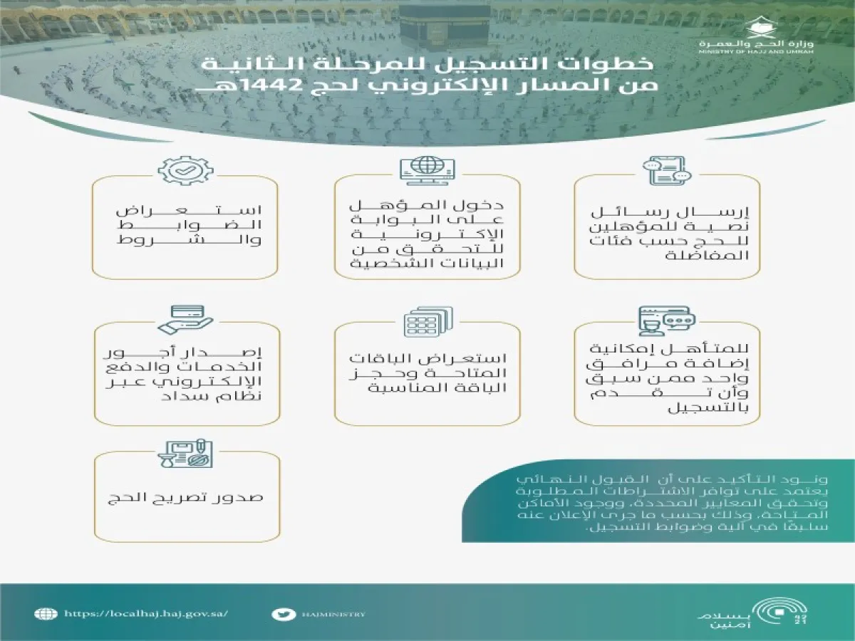 وأوضحت خطوات المرحلة الثانية من التسجيل في المسار الإلكتروني لـ حج1442هـ، كالتالي: