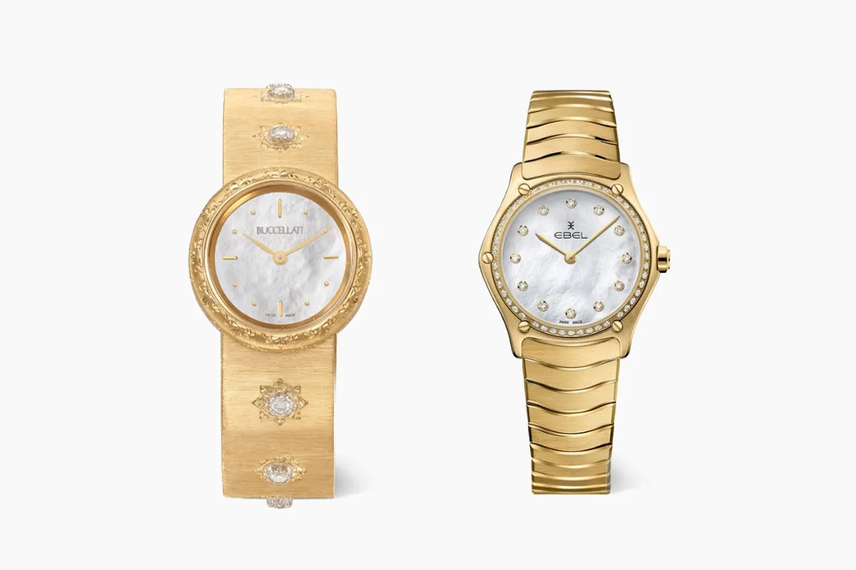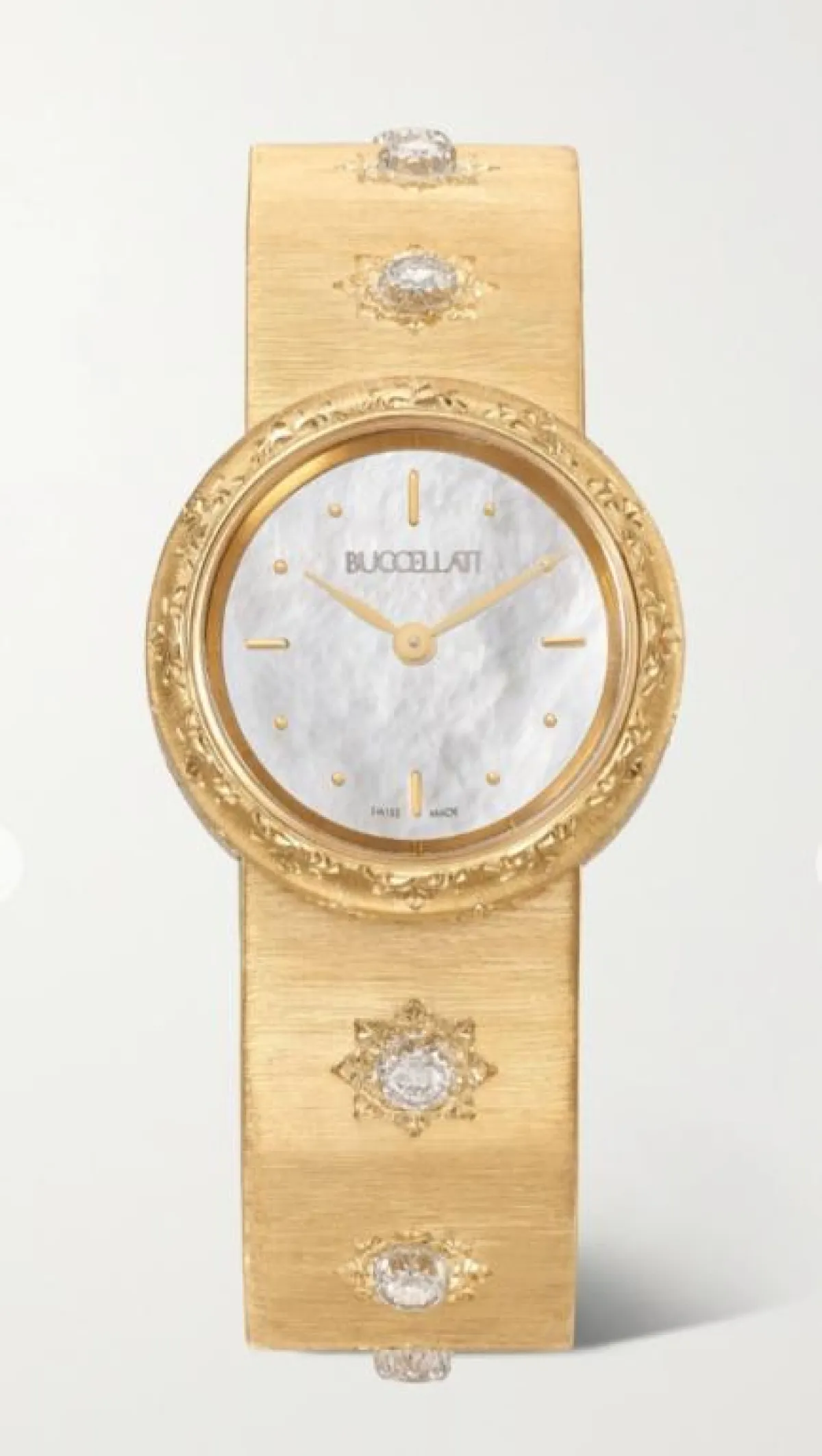 تُفضل معظم النساء اعتماد الساعات غير التقليدية والضخمة لتعبر عن شخصيتها، وقد لفتتنا ساعة ذهب من ماركة بوتشيلاتي Buccellati التي جاءت بالذهب الأصفر عيار ١٨ قيراطاً، باستخدام تقنية النقش التي تعود إلى قرون مضت والمستخدمة في مجموعتها الرائعة من المجوهرات الراقية، يتميز هذا الطراز النحيف بقرص رخامي باللون الفضي، وصُمم سوار الساعة من الألماس المتلألئ.