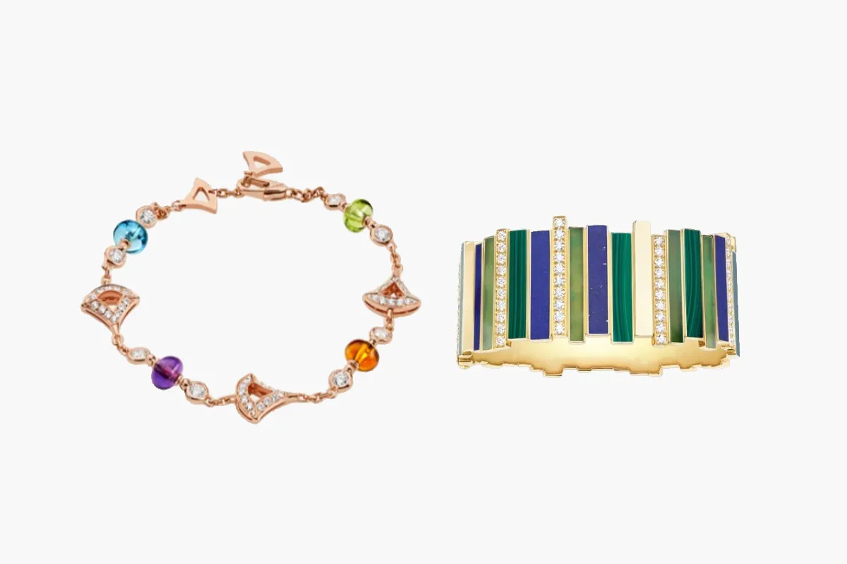 قدمت ماركة ديور Dior العديد من التصاميم الفخمة لأساور ملونة لإطلالات صيف 2021، أعجبنا منها هذا التصميم، لسوار عريض صُمم من الذهب الأصفر، ومُرصع بالألماس (4.30 قيراط)، والملكيت واللازورد، وحجر الكريسوبراسي (الذي ينتمي إلى عائلة العقيق).