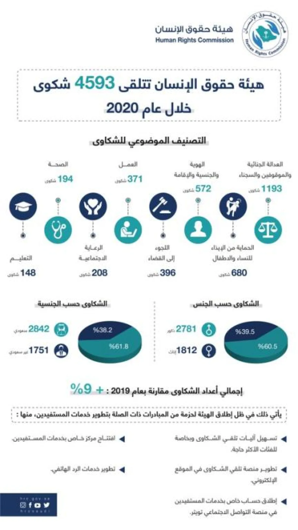 وأفادت حقوق الإنسان من خلال انفوغراف، نشرته عبر حسابها الرسمي على موقع التدوينات المصغر "تويتر"، أنها تلقت 4593 شكوى خلال 2020م، إذ بلغ عدد الشكاوى التي تعلقت موضوعاتها بقضايا العدالة الجنائية والموقوفين والسجناء 1193 شكوى بنسبة 25.97%، بينما كانت المتصلة بقضايا الحماية من الإيذاء للنساء والأطفال 680 شكوى بنسبة 14.81%، في حين بلغت المتعلقة منها بالهوية والجنسية والإقامة 572 شكوى بنسبة 12.45%.