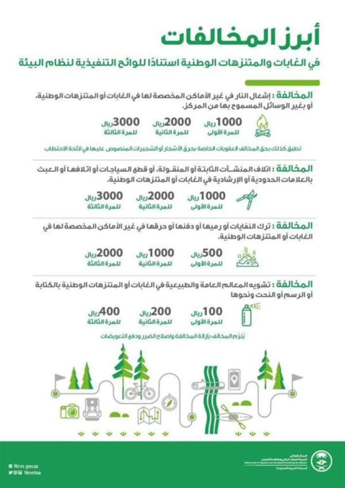 وأشار إلى أن عقوبة التخييم في الغابات أو المتنزهات الوطنية دون ترخيص، تصل إلى 3 آلاف ريال لكل مخيم، بينما تصل عقوبة إنشاء المباني أو نحوها في الغابات أو المتنزهات الوطنية من دون تصريح إلى 20 ألف ريال.