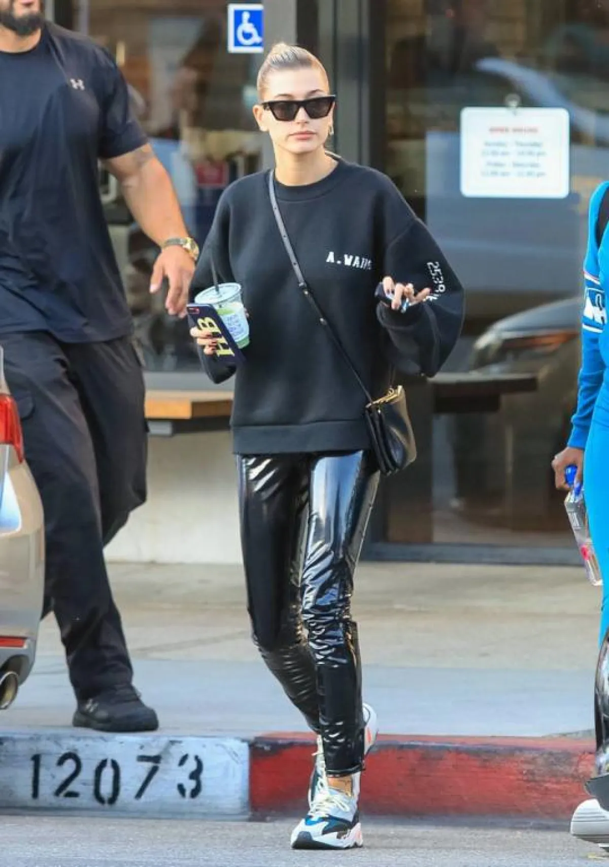 ارتدت السوبر موديل الكنزة السوداء الواسعة الطويلة مع سروال من اللاتكس الضيق وانتعلت الحذاء الرياضي الأبيض. وحلمت هايلي الحقيبة على شكل كروس بودي ووضعت نظارات مستطيلة سوداء وسرحت شعرها عبر شينيون مشدود الى الوراء.